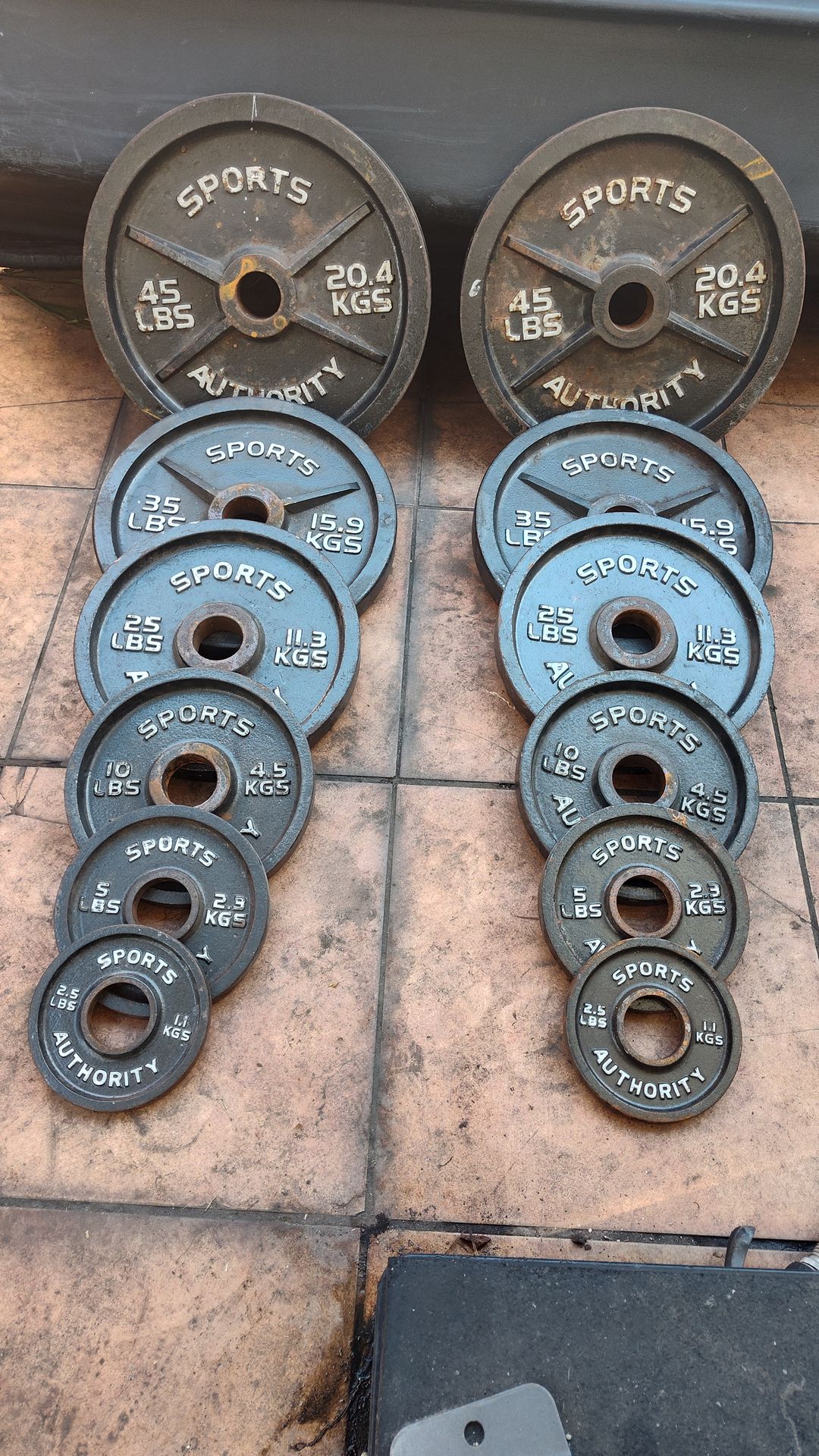245 lb olympic weight set for sale. The weights have been garage kept and they're in great condition. Just a few scuffs from regular usage. Asking $240 or best offer. Set includes: 2x45 2x35 2x25 2x10 2x5 2x2.5