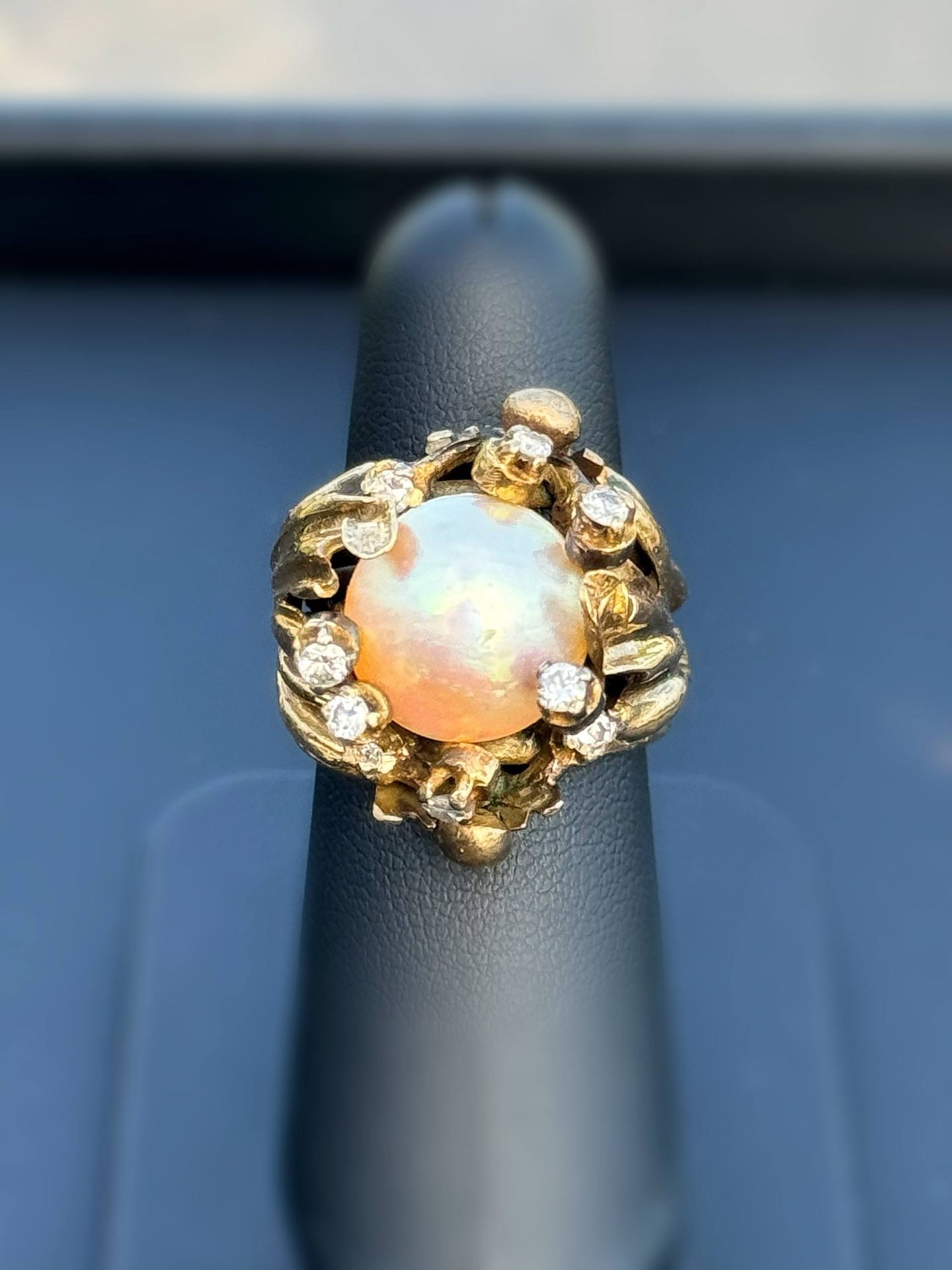 This gorgeous ring is made of solid 14k yellow gold with 10 natural diamonds round shape. The ring was probably made in the 60-70s of the 20th century, in the Modern Art Nouveau style, using bizarre natural forms and unusual stones. Ring size: 7. Total weight of diamond is approximately 1 carat. Total weight: 20.7 grams. This accessory has a beautiful oxidation, we left the ring in an untouched condition, which emphasizes its age. The best choice for you. Perfect gift! β€οΈππ We buy Rolex and Audemars, patek . Do layaway in vipawn Boca Raton π₯ππΈ