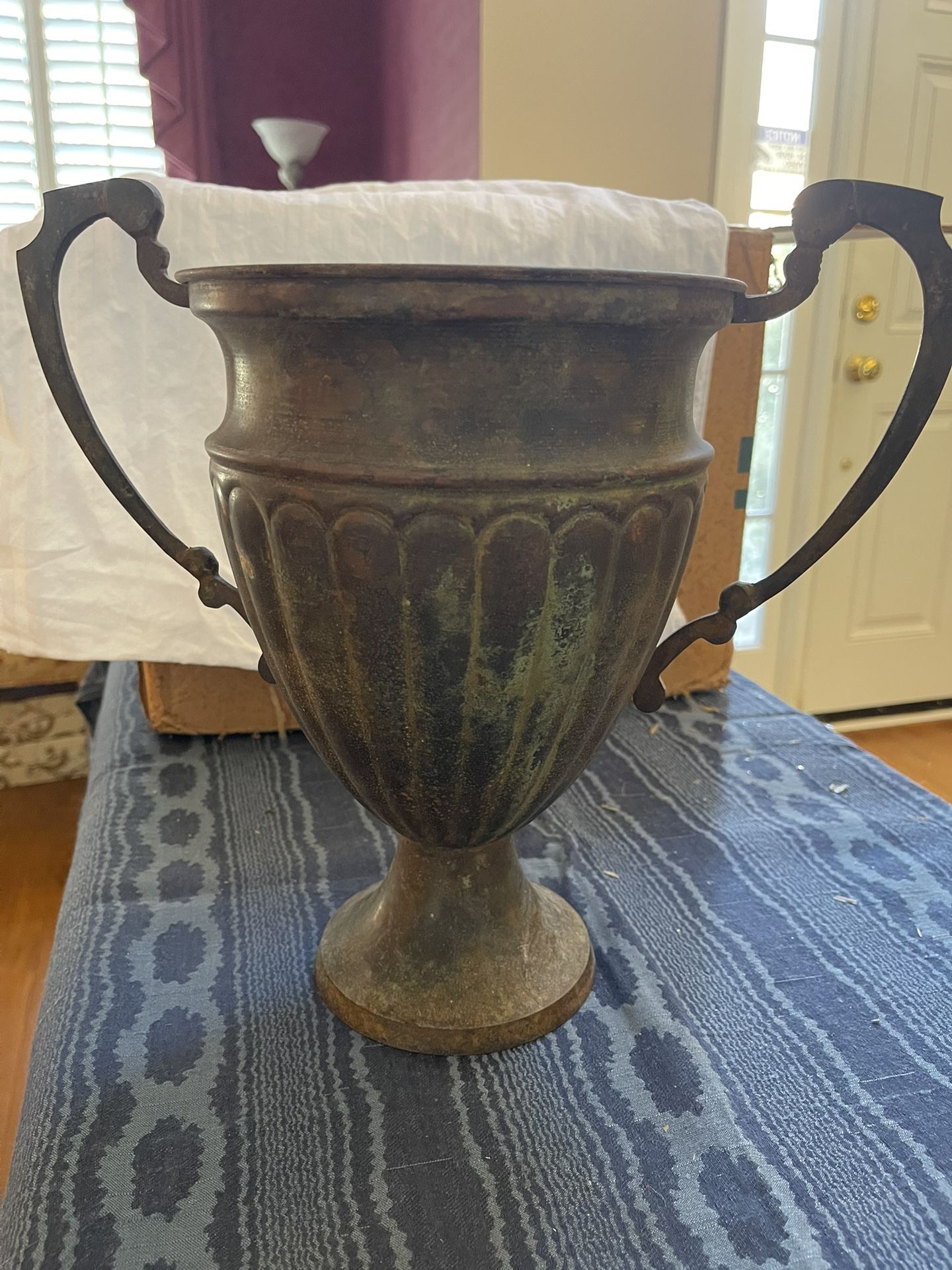 Metal container. Approx 12.5” high. So, as I dusted off this planter / flower pot / container my imagination kicked in… Family reunion, friends weekend…pickleball, corn hole, spades / hearts tournament trophy…”the rusty cup” trophy for the victor. 🤷🏼 Patina is free. Cash only I do not respond to “still available?” inquiries. Driveway pick up in Doraville. Thanks!