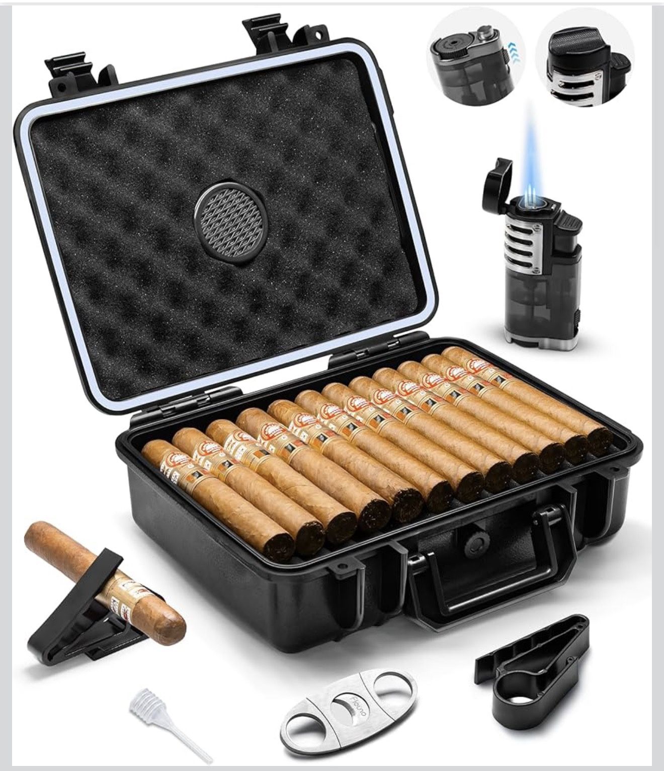 Flauno Travel Cigar Humidor - Large Portable Humidor Case with Lighter (Without Gas), Cutter, Humidifier, 2 Holders, Waterproof & Crushproof, Airtight Seal, Holds 36 Cigars. Disclaimer: All images are of actual product being sold. Please check photos. Feel free to message me with any questions. FINAL SALES. SOLD AS IS. No returns. From Smoke & Pet Free Home.