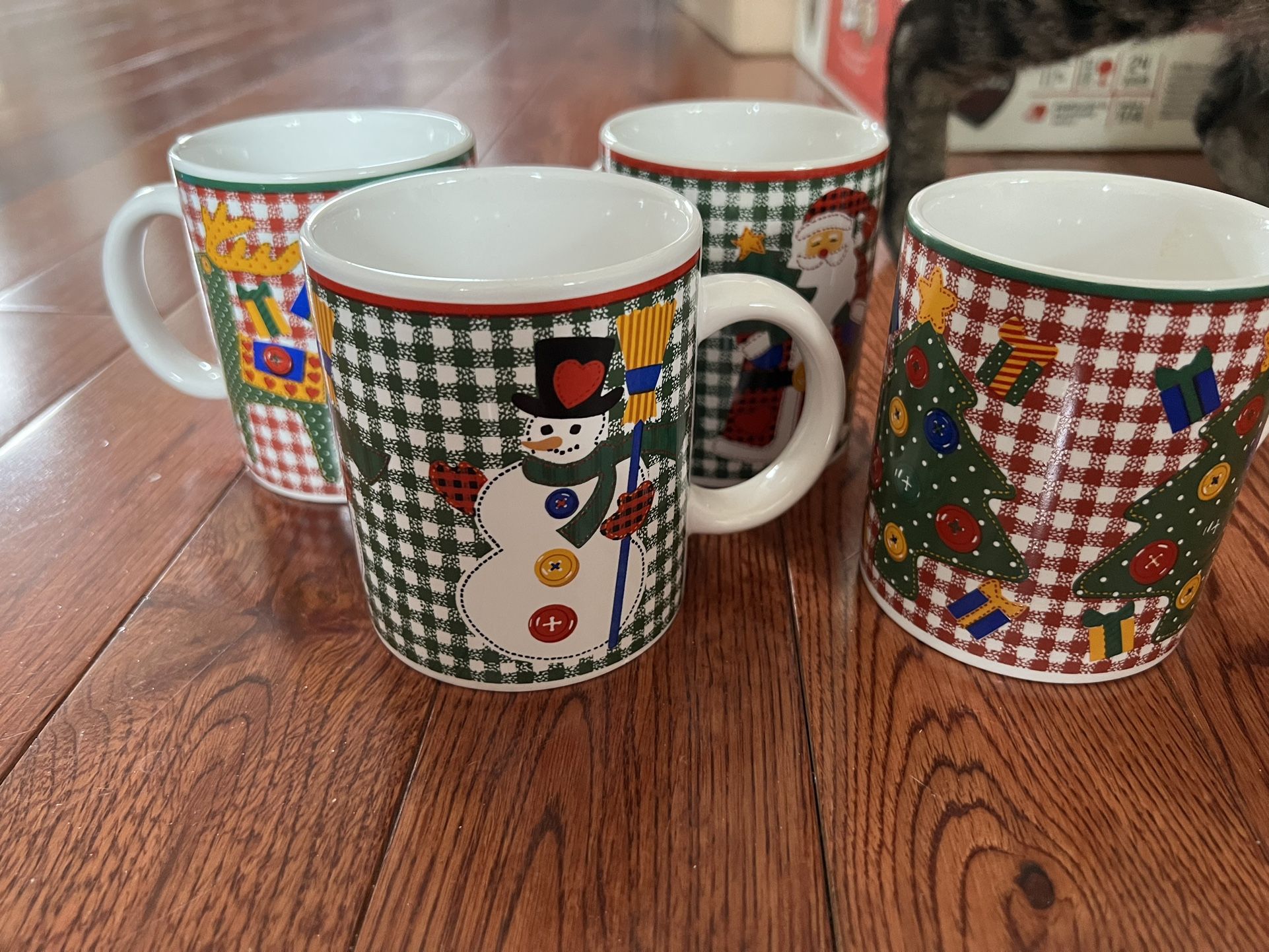 Set of 4 Christmas mugs. Never used. No chips or cracks. Santa mug, tree mug, snowman mug and reindeer mug. Dishwasher and microwave safe.