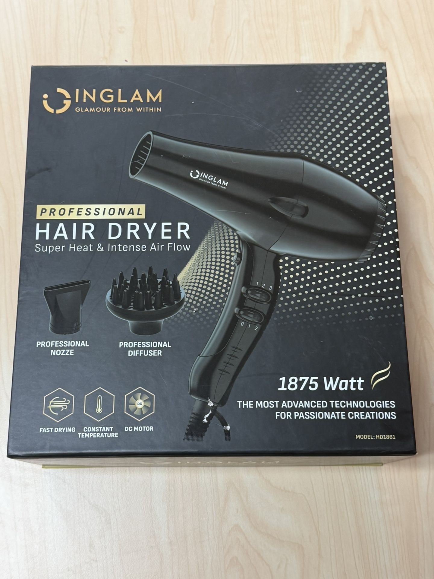 New INGLAM professional hair dryer. Never used. This 1875 Watt dryer has super heat and intense air flow. Comes with a professional nozzle and diffuser. Features fast drying, constant temperature, and a DC motor. Also has cool shot button, air temperature setting, and air speed setting. It's ergonomically balanced and quiet performance.