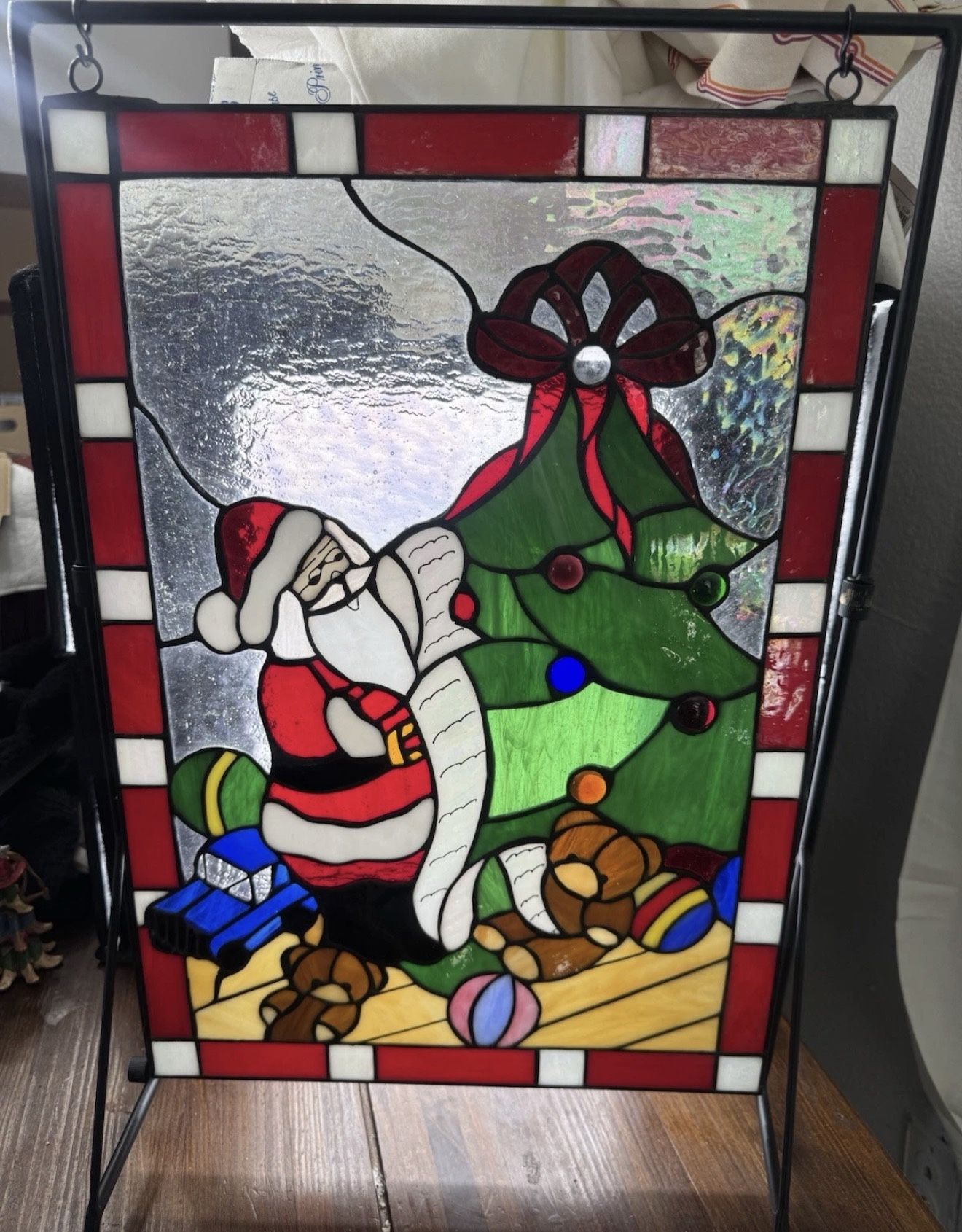 NEW Kirkland Christmas Santa Stained Glass Panel Metal Stand 14x20 RARE HTF