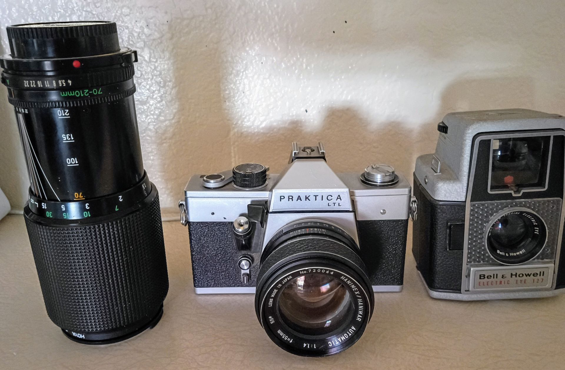 Praktica LLC — basically an LTL Pro Max. Open-aperture metering with electric lenses, extra contacts everywhere, a unicorn battery, and a strong sense of technical ambition. The Bell and Howell Electric Eye 127. This was one of the very first fully auto exposure cameras made and it arrived on the market in 1958. Despite being a simple single speed ( 60th sec?) fixed focus camera it has a very well made all metal body and a huge bright viewfinder. It has double exposure prevention and a degree of manual over-ride is possible by using the flash settings. The metering is still working after 67 years! Canon FD 70-210mm f/4 manual focus lens. Zoom Type: Features a one-ring push-pull mechanism for both zooming and focusing. Macro Mode: Includes a macro feature at the 70mm setting, allowing for a minimum focusing distance of approximately 0.44 meters. Aperture: Offers a constant maximum aperture of f/4 throughout the entire zoom range, with a minimum aperture of f/32. Compatibility: Designed for manual focus film cameras but can be adapted to mirrorless digital cameras.