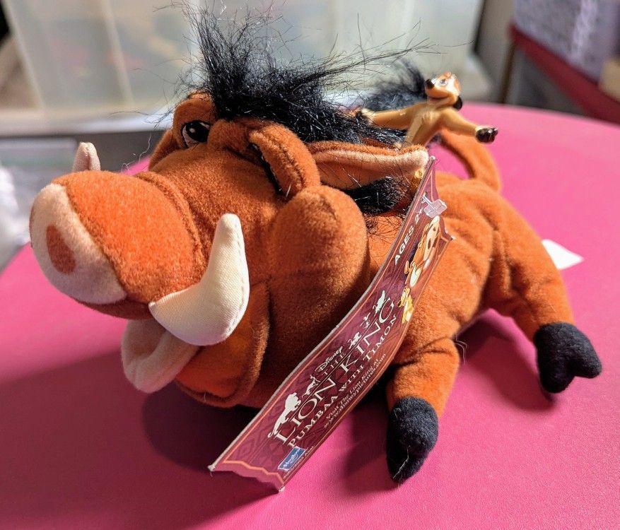 Disney Lion King characters Pumbaa and Timon figures. Pumba is a plush beanie and Timon is a vinyl character that can become attached and disattached from Pumba while remaining tied to Pumbaa. 7" L. Circa 2002; made by Disney. New