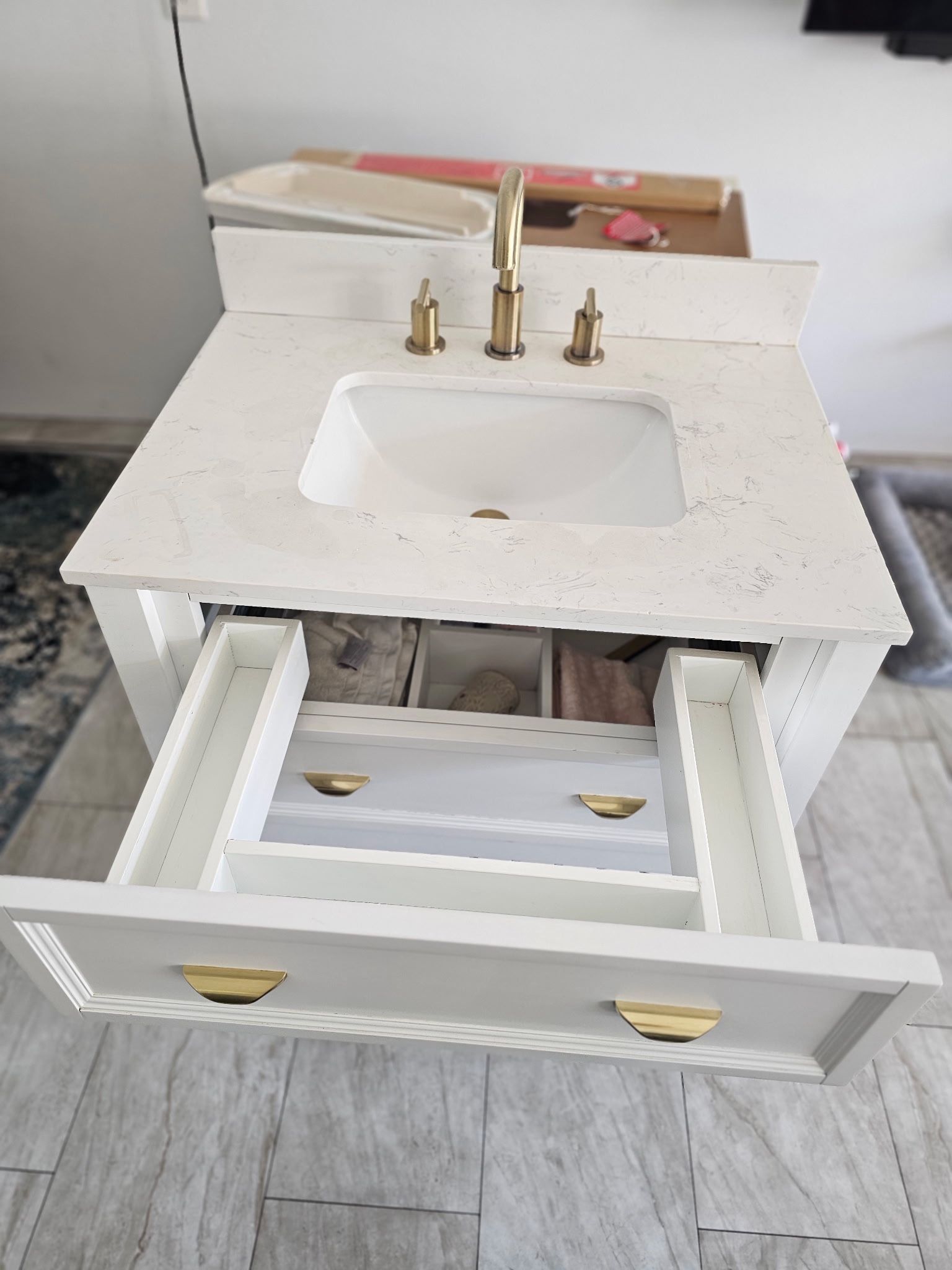 30 inch white bathroom vanity with gold faucet. Gold hardware