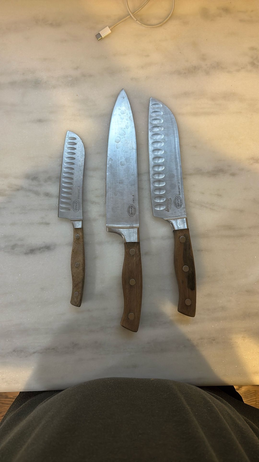 I have three World market brand kitchen knives the first is an 8 inch chef knife. The second is a 7 inch Santoku knife and the third is a 5 inch Santoku knife