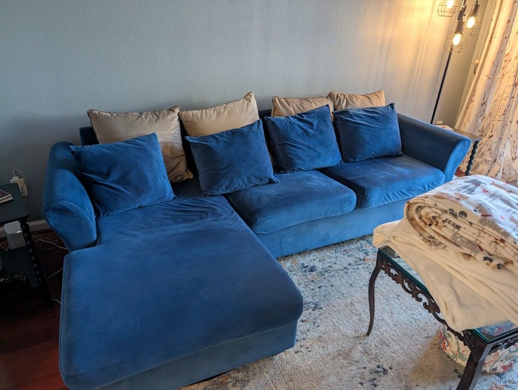 Blue suede couch purchased from Wayfair 5 years ago. It's two pieces that snap into each other. Normal ware, no major stains. A few spots on the armrest and left cushion. All cushions have zippers so cases can be washed. Comes with all pillows shown in picture. Beige pillows were purchased last year from T.j Maxx. Was in a house with kids and dogs
