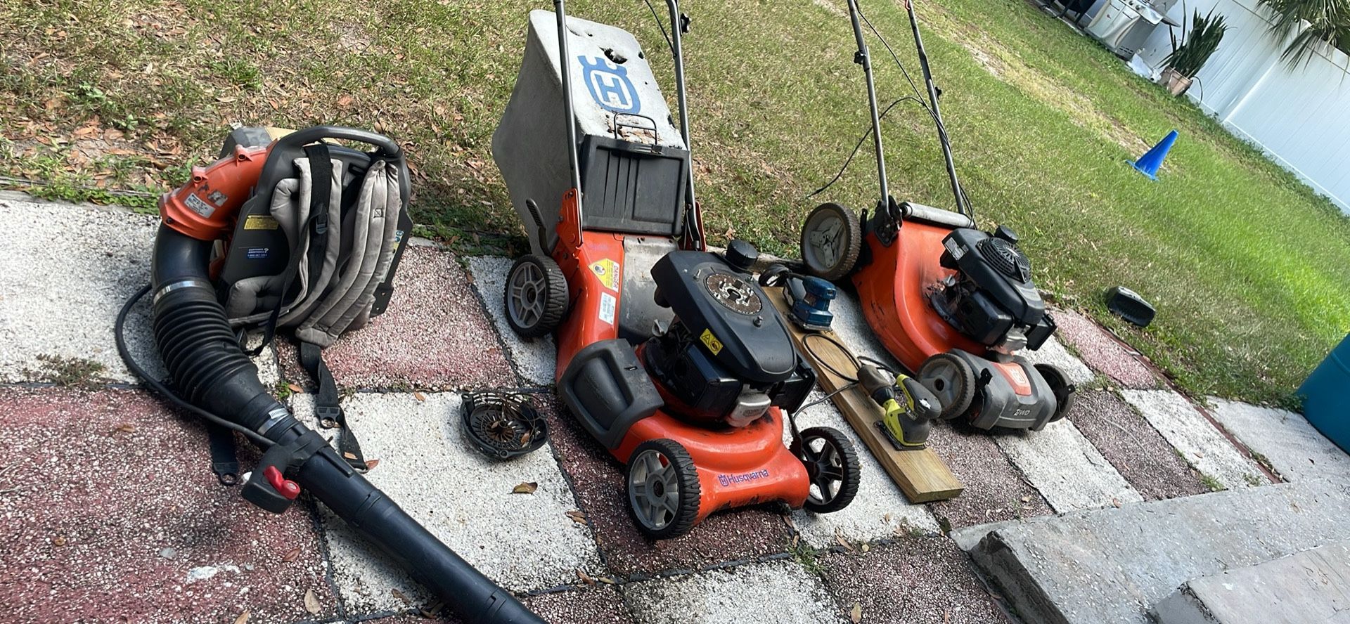 Mower runs but needs new entire cord housing small problems with the carb. The larger one won’t run and the self propelled system is gone bad wheels needs new cable probably probably better for parts Backpack blower starts has new coil but won’t stay running or run when pressing the trigger probably needs a new Carb or gasket Some sanders for 20 if you want to know more just send me a message and you can shoot me and offer Zelle or Cash only (if you only want one of them just send a message)