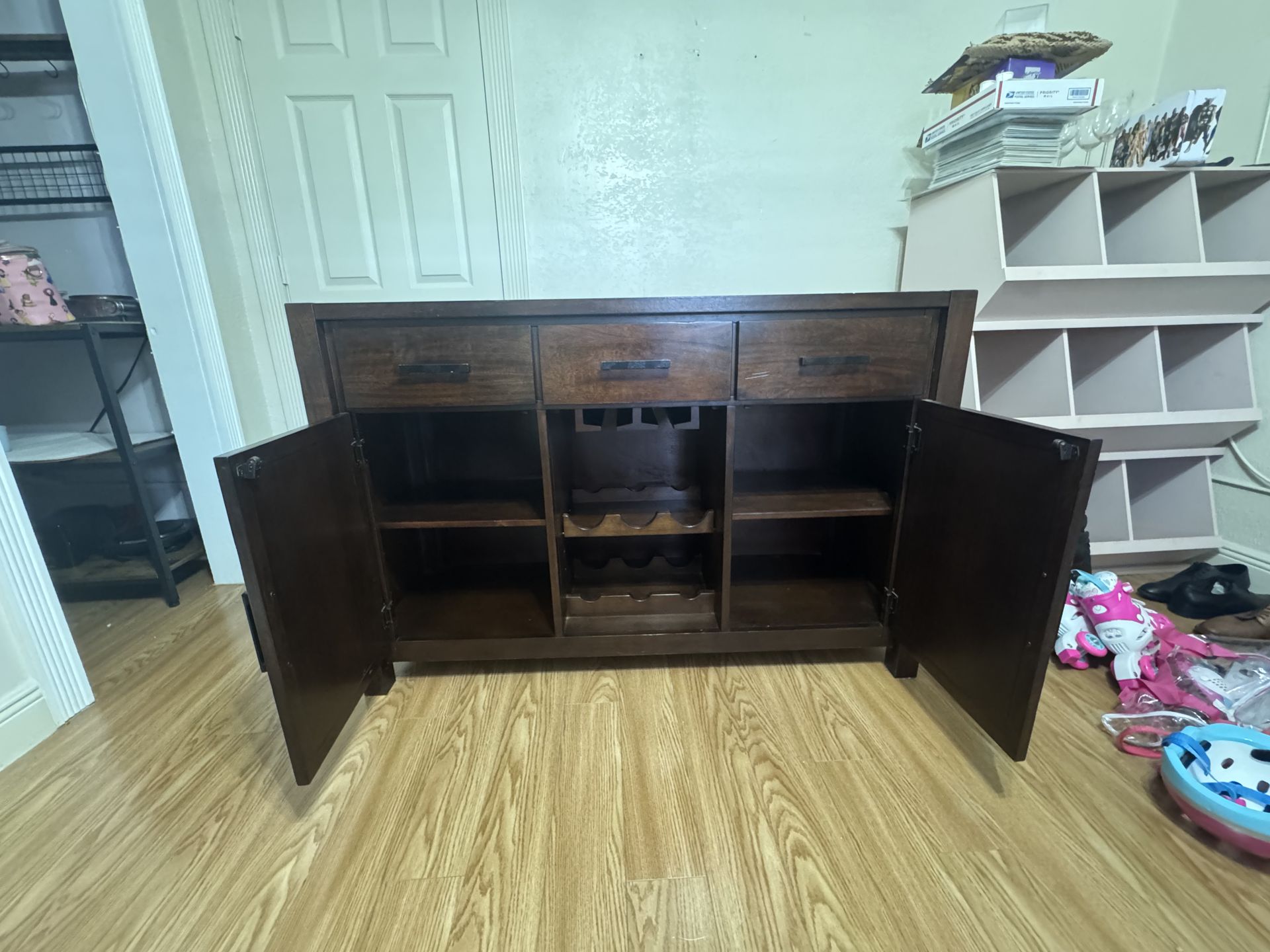 Beautiful solid wood credenza/buffet cabinet in very good used condition. This piece features a rich dark wood finish with modern farmhouse-style X-panel cabinet doors and sturdy metal handles. Length-54’ Width-18’ Height-36’ The cabinet offers plenty of storage, including: • 3 top drawers for utensils, linens, or small items • 2 side cabinets with shelves for larger storage • Center wine rack that holds multiple bottles • Additional open storage in the middle section Perfect for use as a dining room buffet, bar cabinet, sideboard, or living room console. Condition: Used but well maintained and structurally solid. There are a few minor surface marks from normal use (see photos), but overall it looks great and functions perfectly. Drawers can be cleaned Approximate Features: • Solid and heavy construction • Dark espresso/brown finish • Farmhouse / modern style design • Plenty of storage space