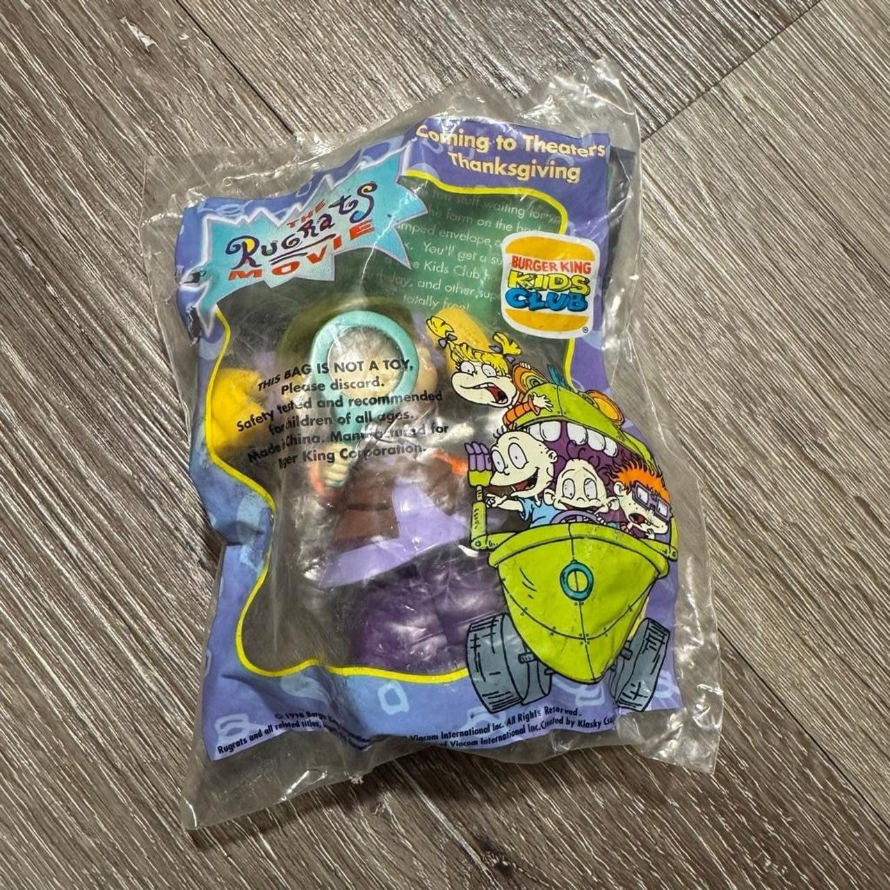 1998 Burger King Rugrats Movie Angelica Action Figure This is a new, sealed Burger King Kids Club promotional toy from "The Rugrats Movie," released in 1998. The plastic bag features colorful graphics of the Rugrats characters and advertises the movie's release around Thanksgiving. Inside, a purple and yellow plastic toy is visible, along with a small paper insert. The bag states, "THIS BAG IS NOT A TOY" and recommends it for children of all ages. The packaging shows minor creasing and a small tear near the top left corner.