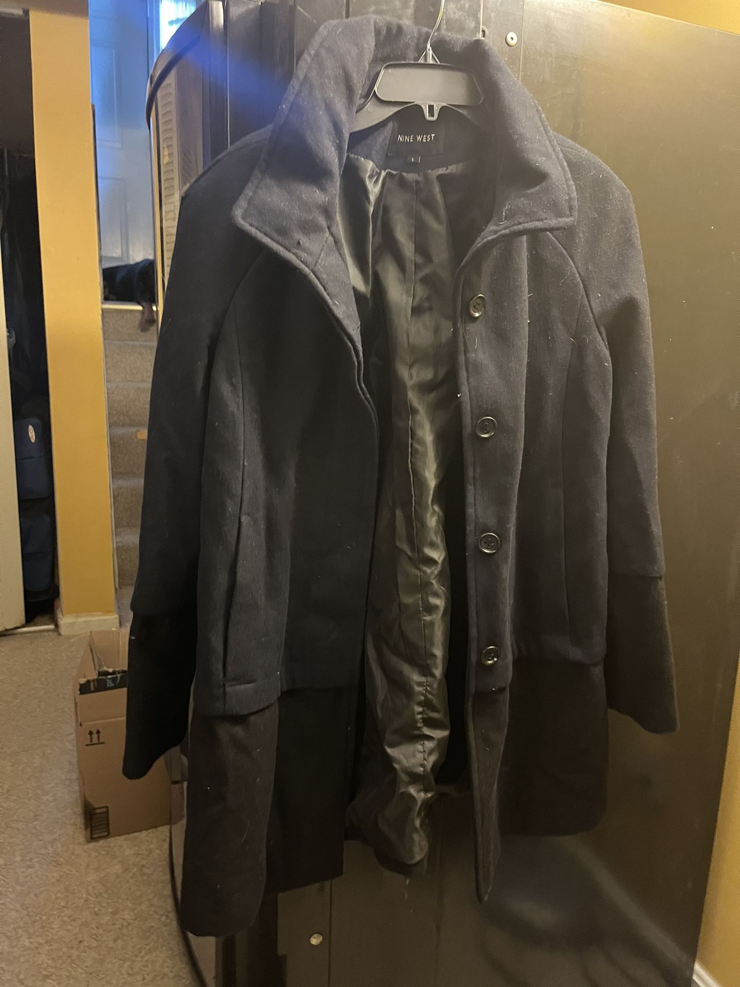Women’s Wool Coat from Nine West. Size L, Great shape and warm. Needs to be cleaned but otherwise a great buy. You can dress this up or down fur whatever occasion.