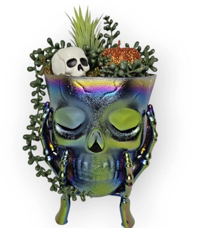 Multicolor skeleton head and boney hands with a faux succulent arrangement. Unique Halloween decor for your home, office, apartment, dorm room, desk, mantle etc.