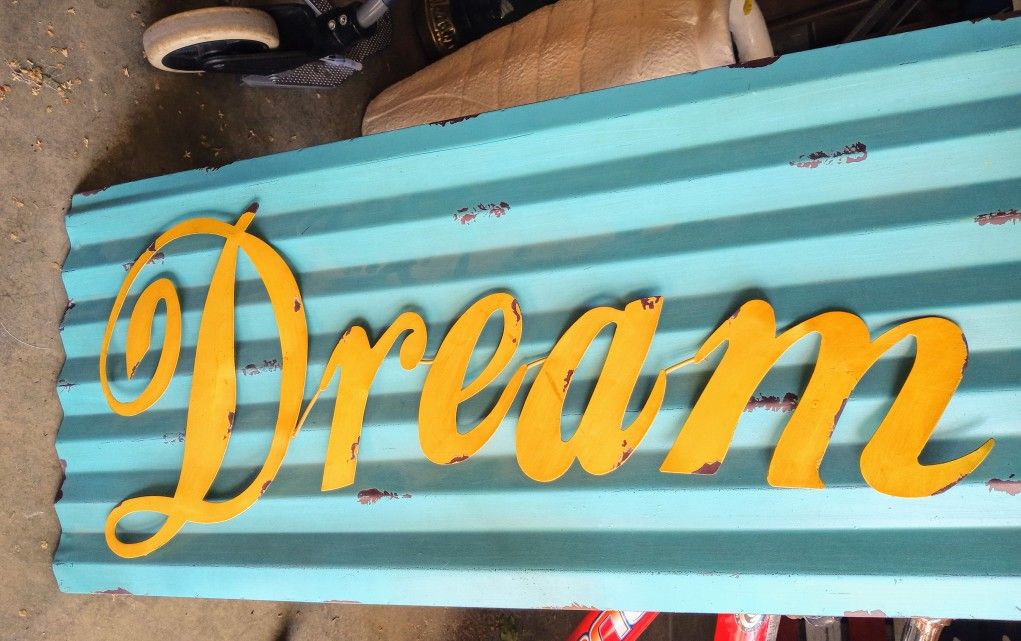 Metal DREAM sign. Made from Corrugated metal flashing. Has hangers on back for easy hanging. Color is a teal or aqua marine and yellow lettering. Measures approx. 30" wide x 20" high. Bought for my daughter but she never hung it??? Go figure....