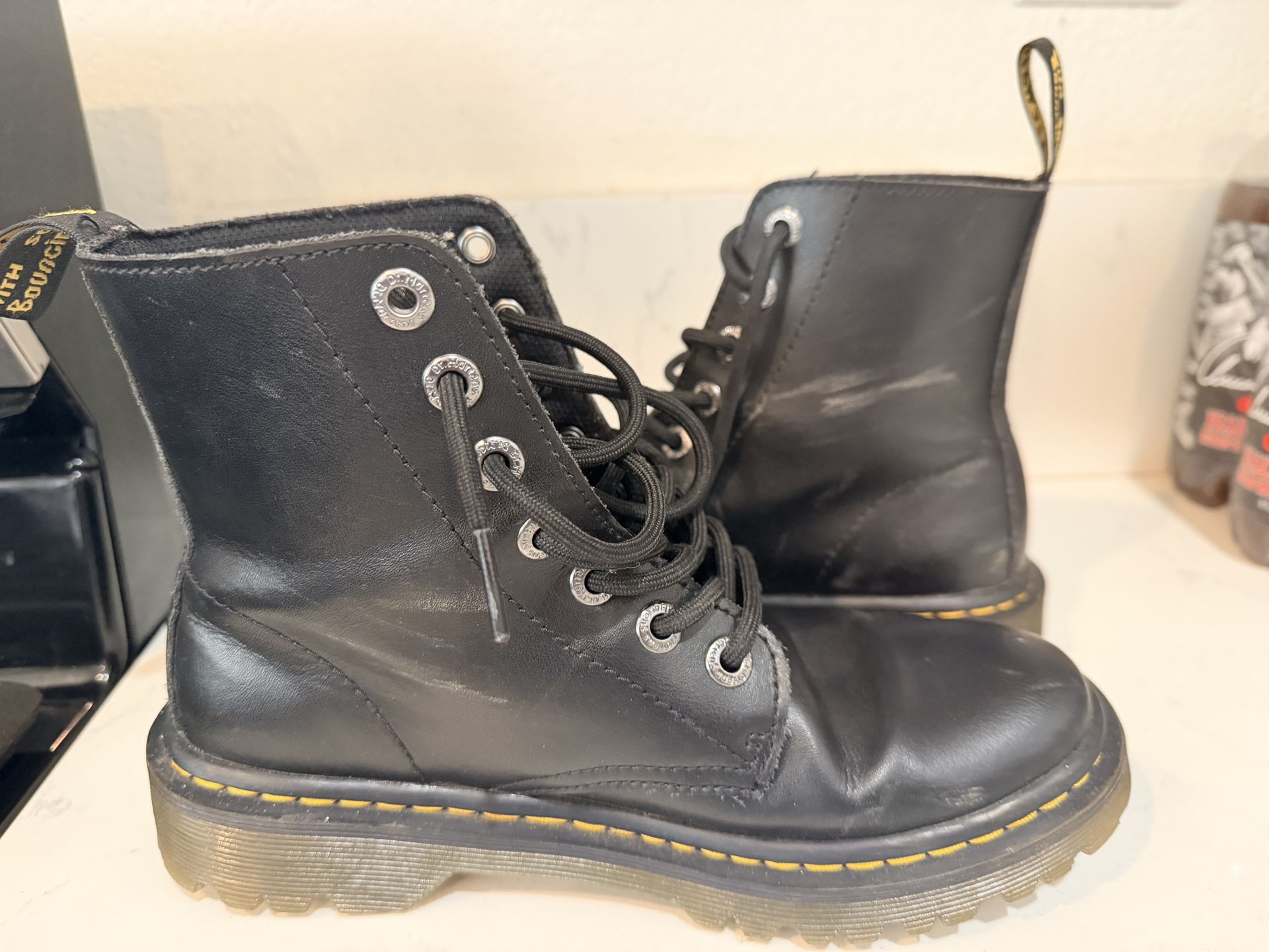 Selling a pair of authentic Dr. Martens Luana boots in classic black leather. These are a great everyday boot—durable, stylish, and comfortable once broken in. ✔ Women’s Size US 6 / EU 37 / UK 4 ✔ Genuine leather upper ✔ Iconic yellow stitching + air-cushioned sole ✔ 8-eye lace-up design ✔ Made by Dr. Martens (model: Luana) 👀 Condition: • Overall very good used condition • Light creasing from normal wear • Minor scuffs (cosmetic only) • Soles have plenty of life left • Clean inside, no major damage (See photos for details) 💡 Why you’ll love them: These are perfect for school, casual wear, or dressing up a little edgy. Dr. Martens last forever and only get better with age.