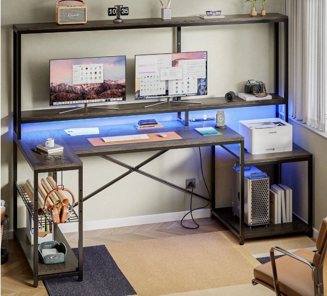 71.5 inch Gaming Desk with LED Lights & Power Outlet, L Shaped Computer Desk with Hutch & Adjustable Shelves. Retro Grev Oak •Charging Port: Equipped with 4 AC outlets and 2 USB ports, this office desk can power up to 6 devices simultaneously The charaing ports are ETL certified and include an on /off switch for convenience and safety •LED Lighting: Features an RGB light strip with 7 static colors and 22 dynamic modes, allowing you to customize the color, brightness, and speed via a wireless remote control • Ample Storage Space: The spacious 71.5" desktop with a monitor stand accommodates 3 monitors and 1 laptop The hutch provides additional display and storage space, while metal hooks keep headphones, bags, and keys organized •Large Workstation: Includes a 19.3" x 19.7" open-tier shelf and an adjustable metal shelf that can be set to 3 different heights and tilted for your preferred angle, making it ideal for gaming or working •High-Quality Materials: Constructed from thick engineered wood and a heavy-duty metal frame, the desktop is available in carbon fiber and wood grain options, offering high resistance to scratches and friction. and is easv to clean. •Dimensions & Customer Service: Desk size: 71.5"L x 31.5"W x 62.2"H All hardware and assembly instructions are included Easy to assemble.