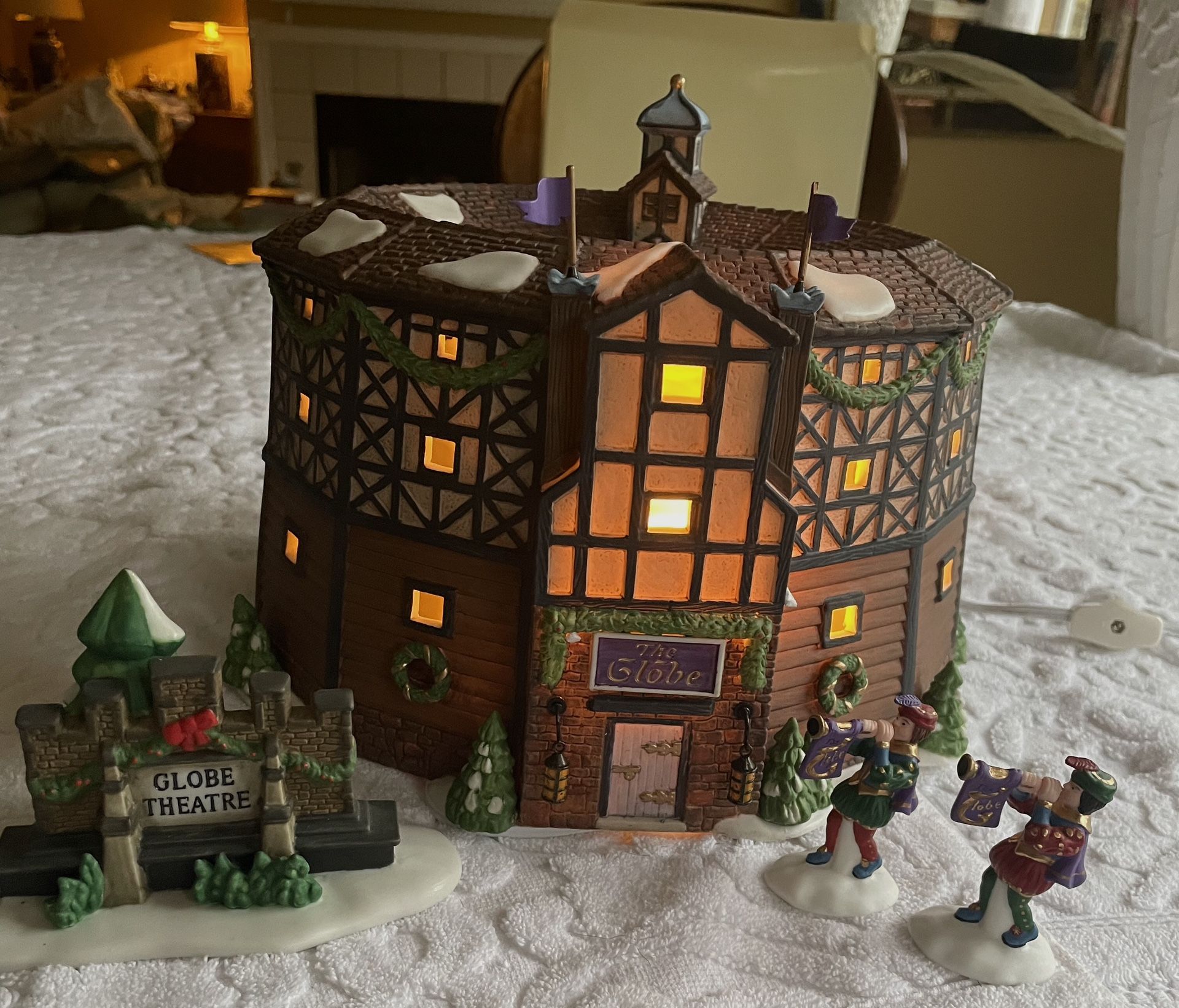 Dept 56 Historical Landmark Series, Dickens’ Village, The Old Globe Theatre. An exceptional piece to add to your village, and to your holiday tradition. I’ve been to the reproduction of the theatre in London, and this piece captures the anticipation of the play. Even the stage door on the interior is partially open, waiting for the production to begin. Building in excellent condition. INCLUDES Theatre 2 trumpeters 2 purple flags for the entrance 2 lanterns for the entrance Plug with 2 bulbs, tested and working Original box in good, but used condition Original storage styrofoam #ChristmasVillage. #OldGlobeTheatre. #OldGlobeTheatre #Dept56 #Department56 #HolidayDecor #ChristmasDecor