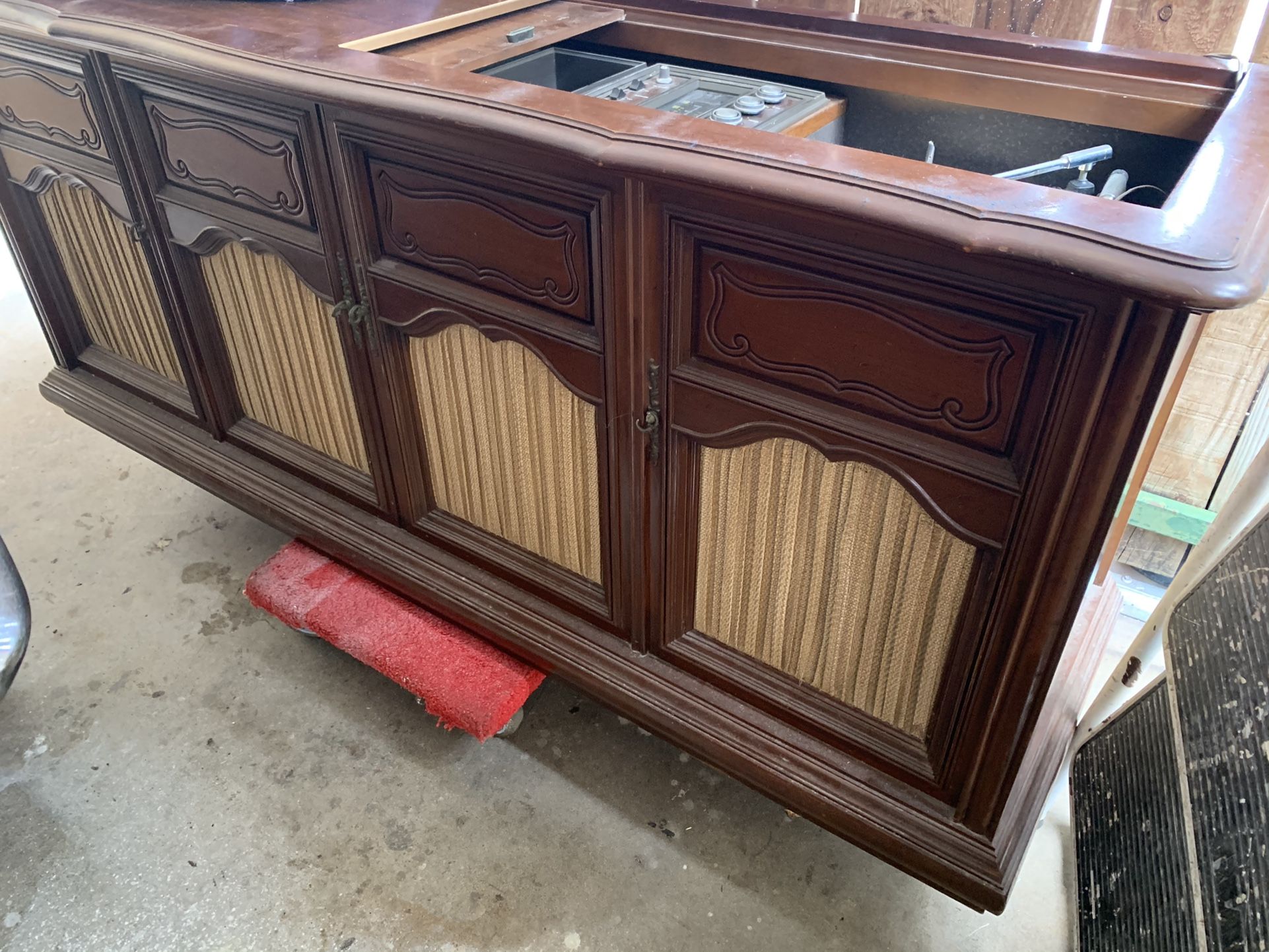 Antique stereo. Record player. Turns on but needs speakers. Mom has named for over 50 yrs all won in great shape.