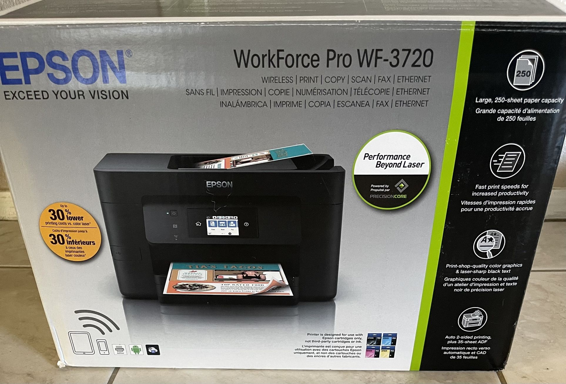 Epson Workforce Pro WF-3720 Printer. WiFi, can print from phone or tablet. Barely used only for one project- Has black ink but needs colored refilled. Ink full refill package is only $28 on Amazon. Printer sells new on Amazon for $297, will sell for $50.