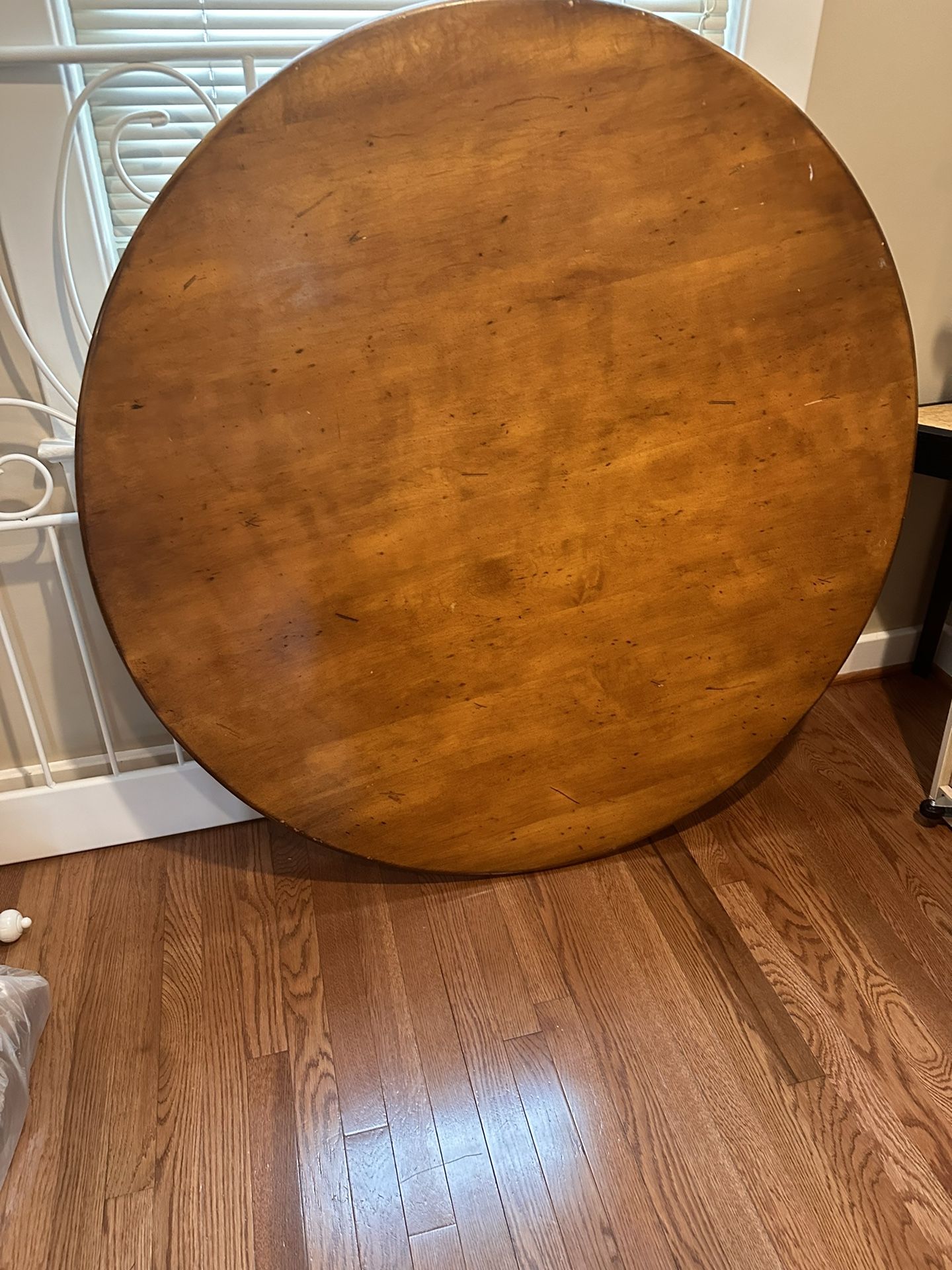 Solid wood 4ft round kitchen or dining table! In great condition (a few scratches that are shown in photos). Super sturdy, beautiful lacquered finish. Hate to part with it, but won’t fit in my new space. $65 OBO. Pickup near Mt Pleasant neighborhood NW DC. Cash, Venmo or Zelle accepted. Already disassembled for easy transport. **note: there are four legs I just didn’t photograph them all!