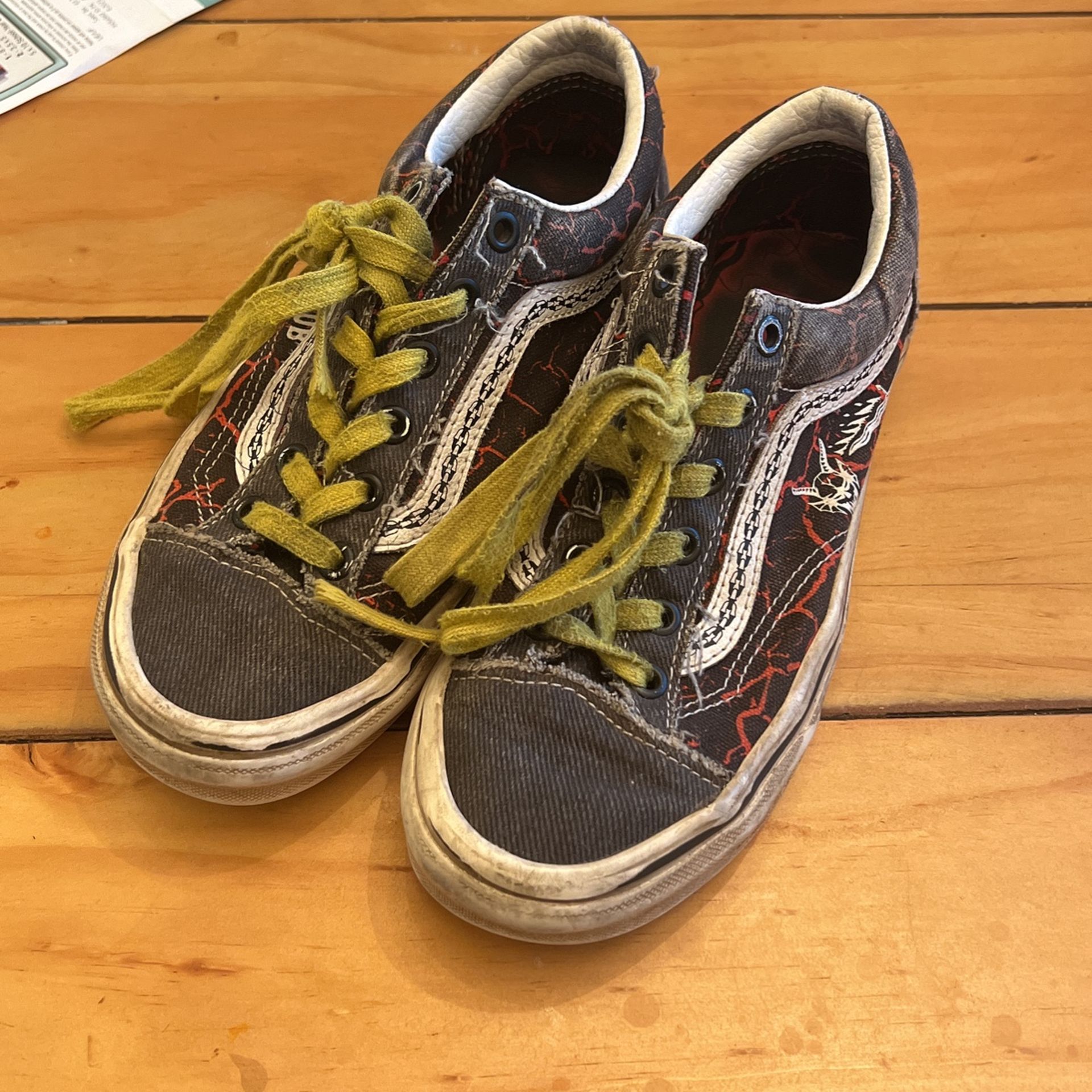 Size 4.5 big kids, stranger things vans. Have been worn, but also as shown in last picture, they are made to originally look dingey.