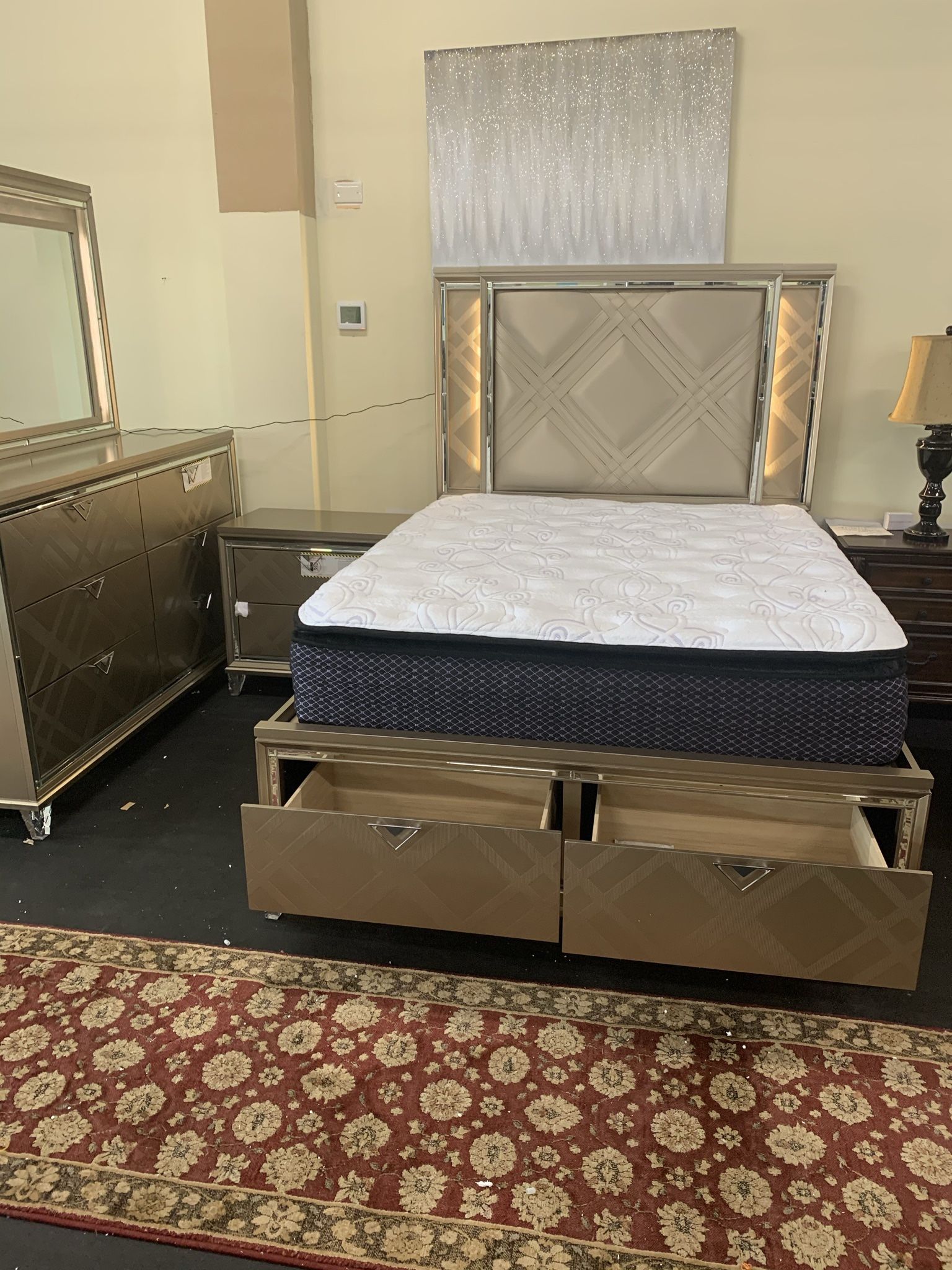 Queen Bed Room Set( Includes Queen Bed Frame, Dresser, Mirror, 1 Night Stand) On Sale