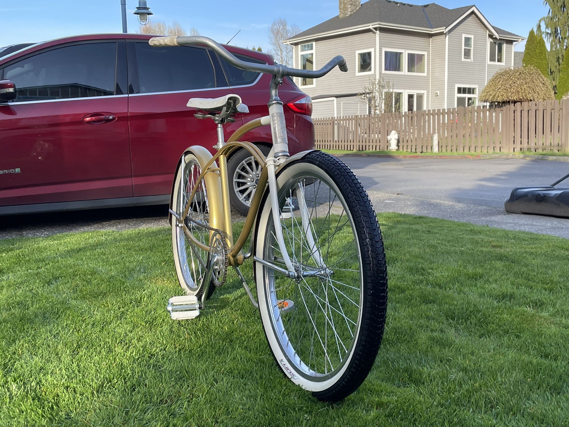 This bike has been restored with new: -Bearings -Wheels -Tires & Tubes -Dice valve stems -Pedals -Crank -Headset cups -Seat Cover What is still original: -Fenders -Front Emblem -Grips -Misc. parts The bike hasn’t been ridden much if at all since I finished putting it together, the paint has some scratches in it, but it does have a good sparkle in the sun. The handle bars aren’t perfect, and the bike has its old bikes creaks and rubs when you ride it, but it’s part of its charm. The kickstand does lean a little bit for you will need to put the kickstand on the high side of a slope. I fit pretty well and I’m 5’10”, but you can be much smaller than me and still fit, but not much taller. Contact me if you have any questions. Shoot me any offer you got $450 obo