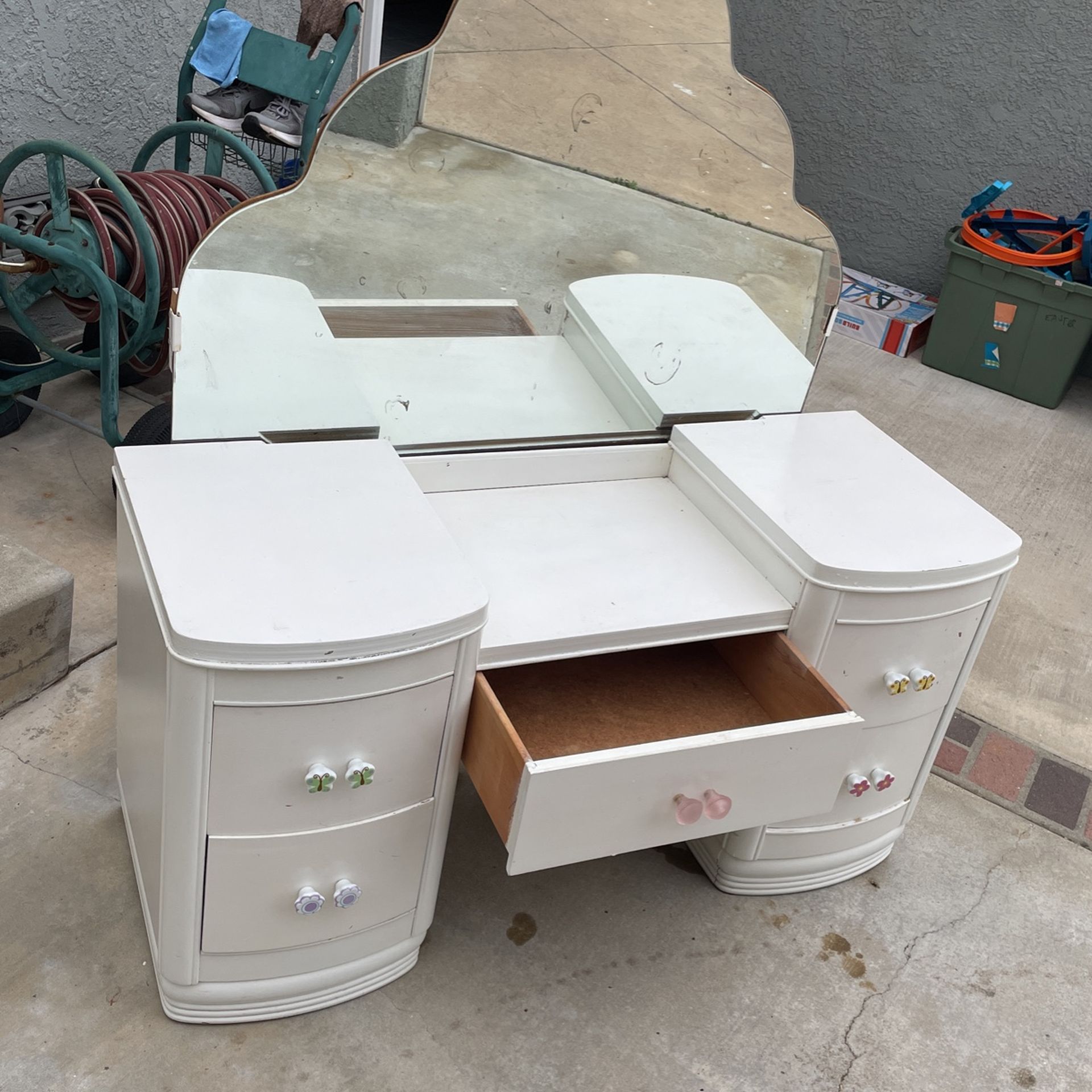 Has some wear to it but believe it is an antique. It has a manufacture sticker on the inside draw . It’s from the early 1900s.