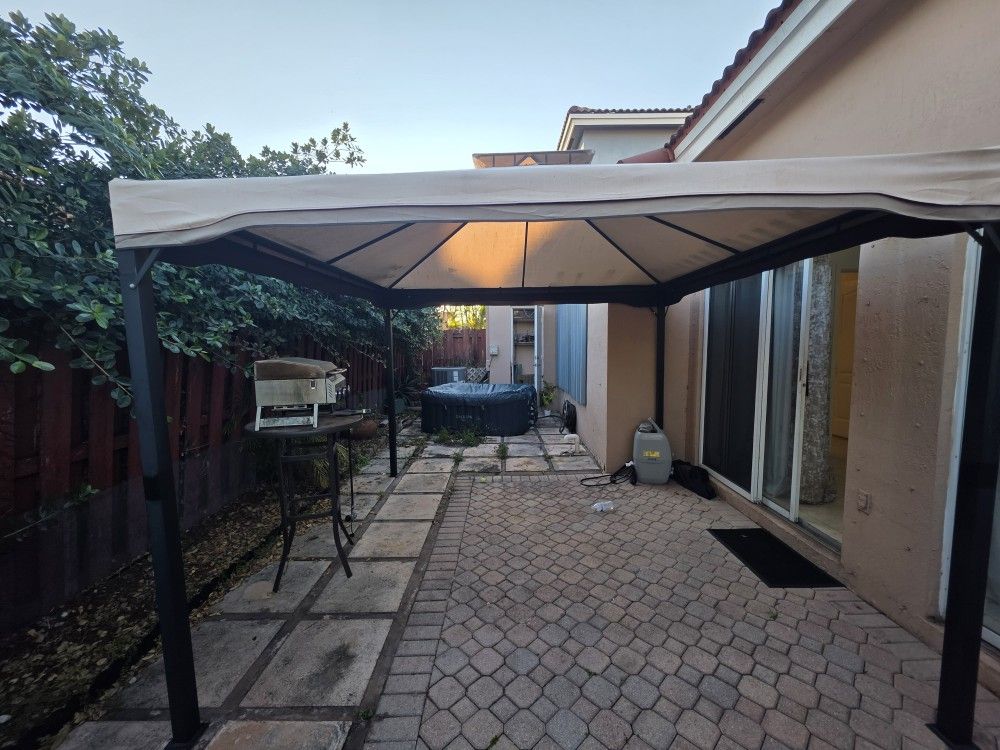 Nice outdoor gazebo. Beige fabric top with a dark frame. Great for shade in backyard.