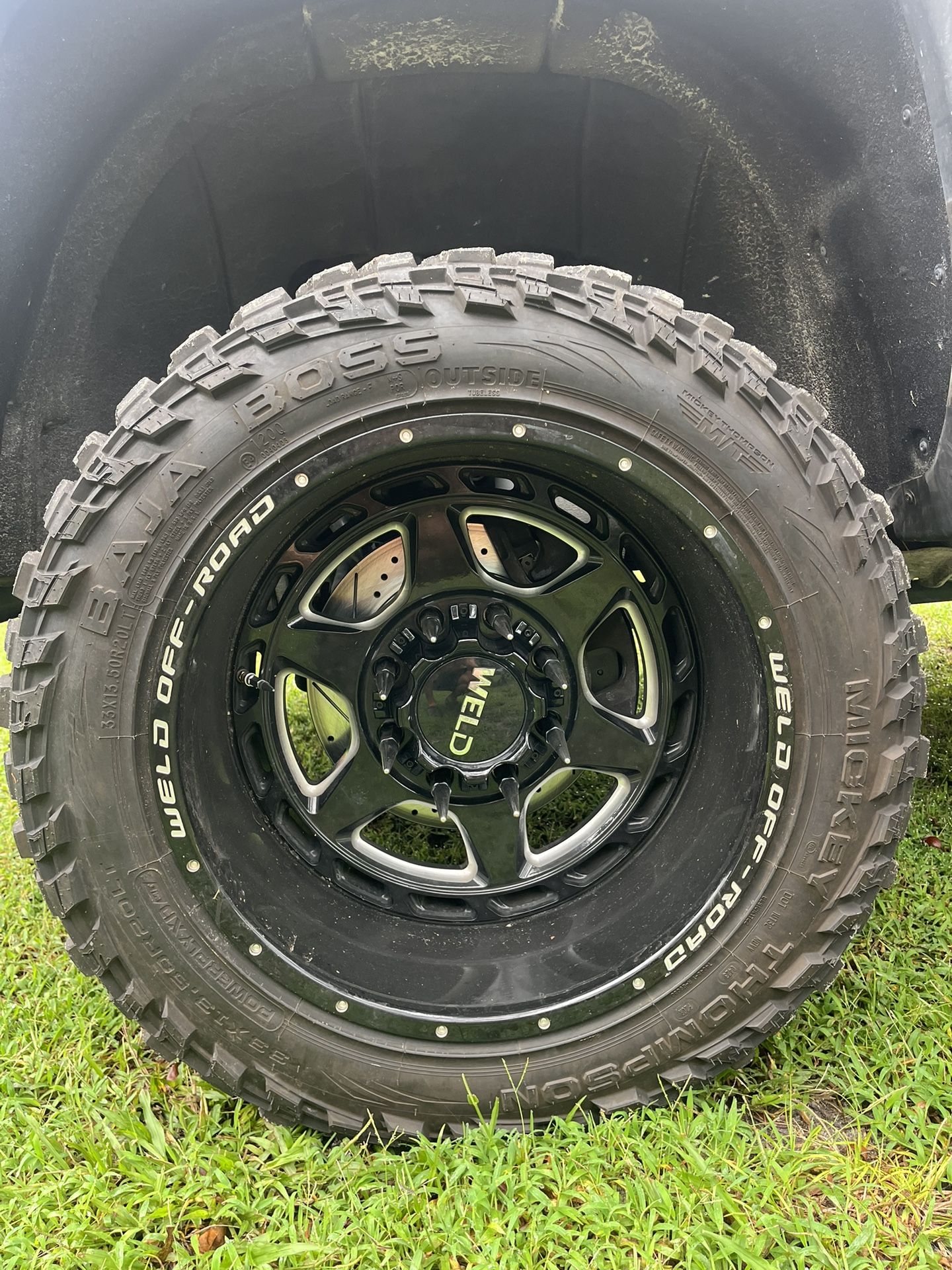 20x12 reverse mount rims weld rims and Mickey Thompson 33x13.50x20 tires only few months old comes with 6” spiked lugs and tire pressure sensors installed 2015-2019 Chevy gmc 8 lug