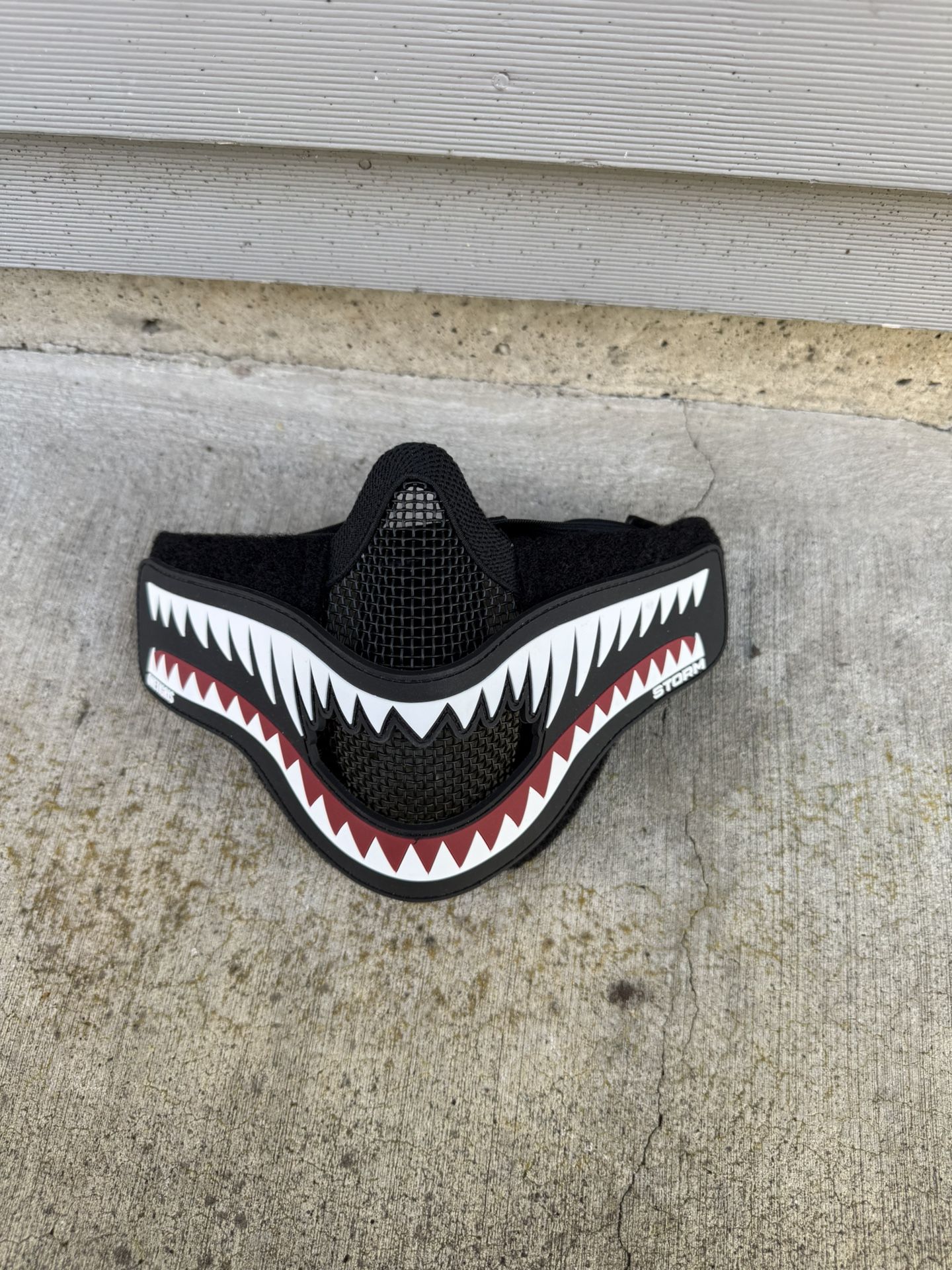 • Brand: OneTigris • Model: Foldable Mesh Mask (Storm version) • Design: Iconic shark teeth "Storm" graphic on the sides. • Material: Steel mesh for the nose/mouth area with padded fabric sides for comfort. • Fit: Twin adjustable elastic head straps for a secure, non-slip fit.