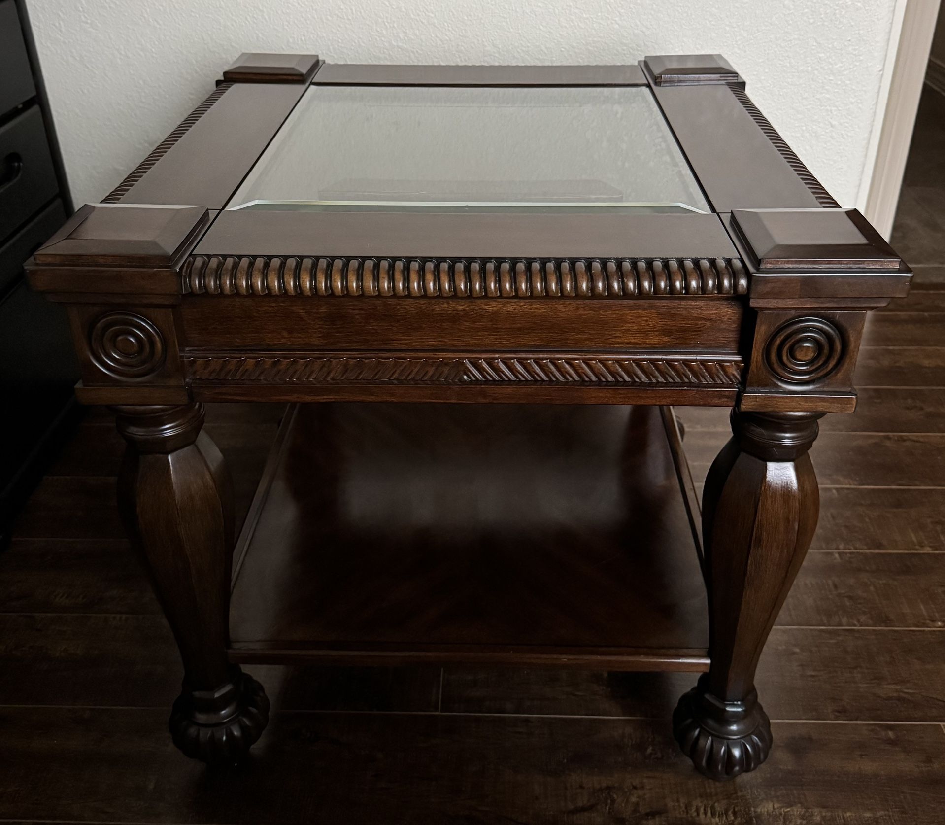 Beautiful end table in great condition. The table dimensions are 26 in x 26 in x 24.5 in H.
