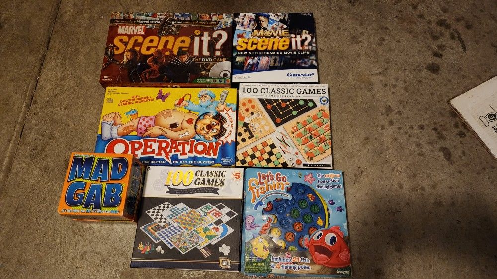 These are board games. Im asking $20 for all. Marvel Scene It Movies Scene It Operation 100 Classic Games (2) Mad Gab Let's Go Fishing