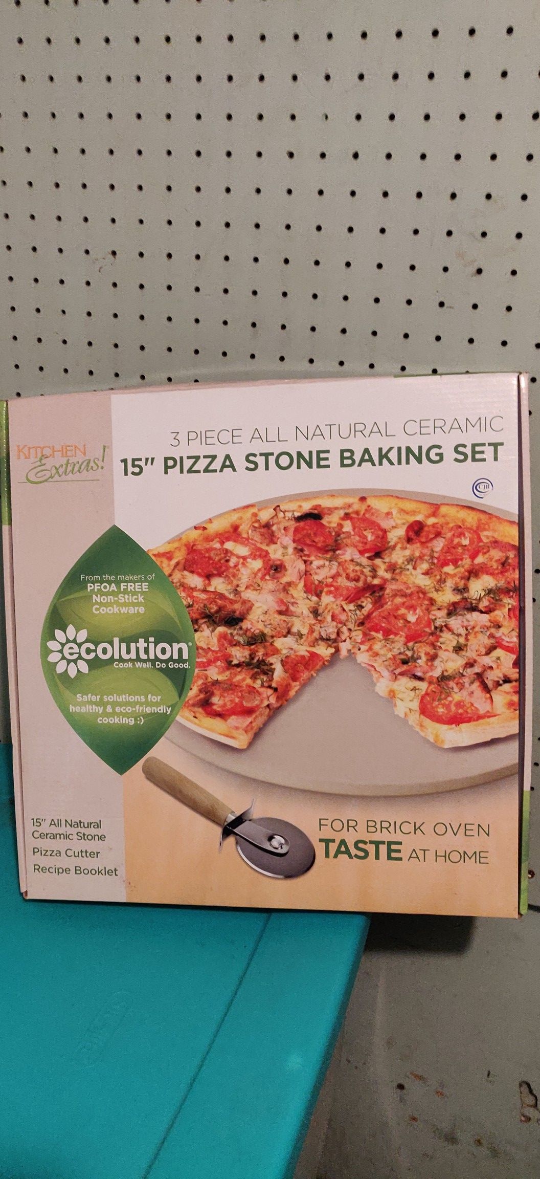3 piece pizza baking stone set. Comes with stone, pizza cutter, and recipe book. Never used. NIB.