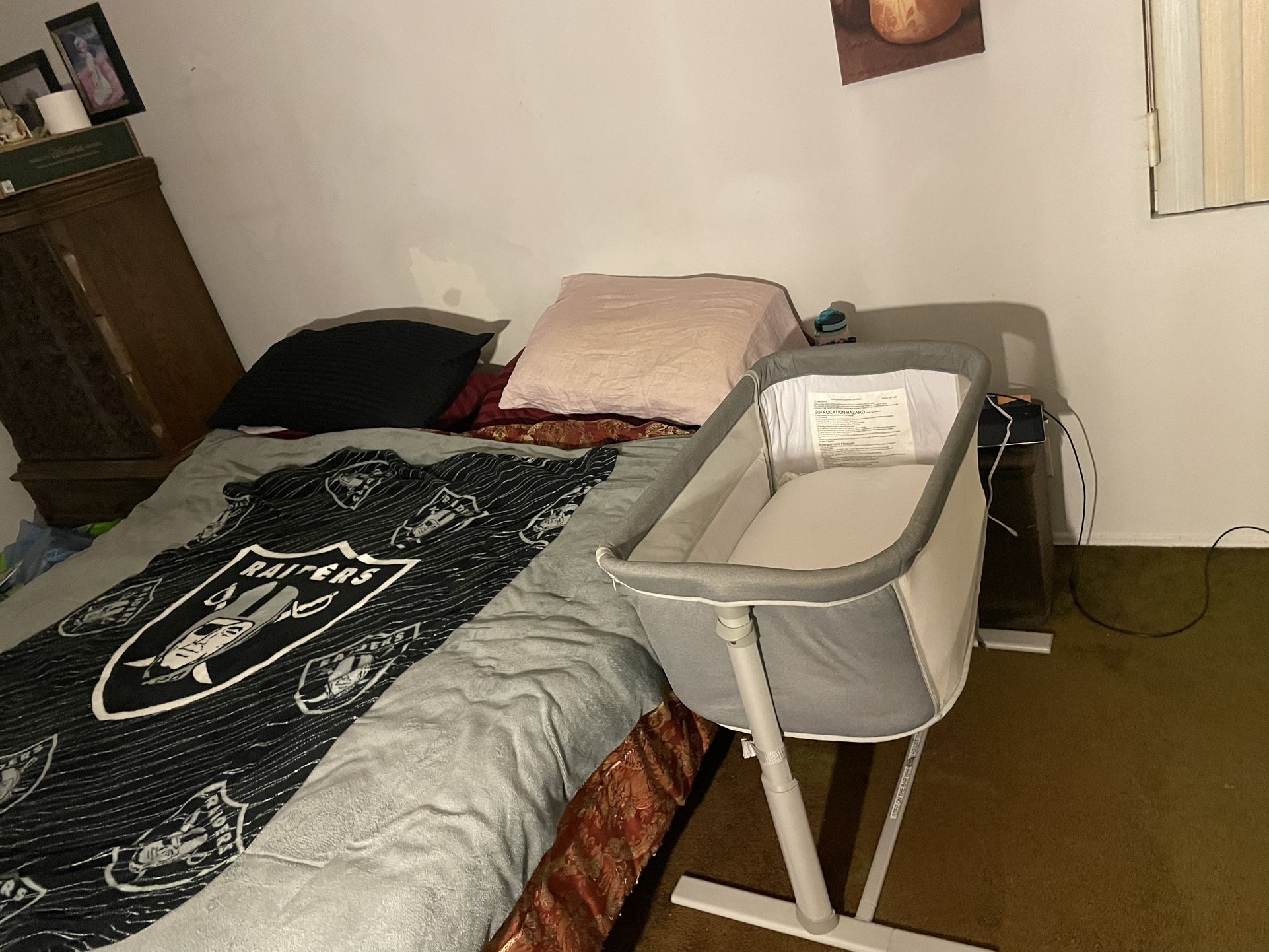 Gently used bedside bassinet with mattress, mattress protector, sheets and blanket