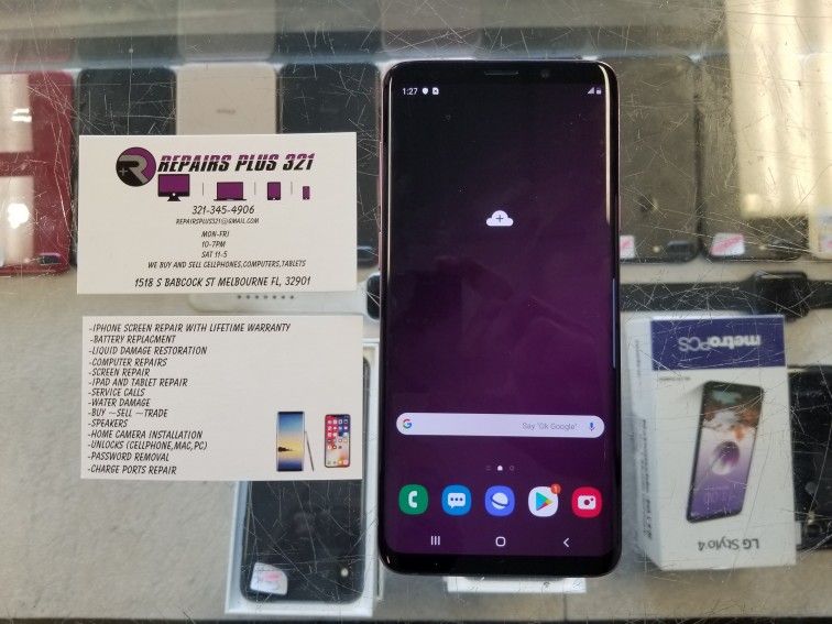 We have a purple unlocked Galaxy S9 Plus 64gb for sale! It comes with a 60 Day Warranty! Charger included! We offer financing and we even give you a chance to extend the warranty to one year! Come Visit Repairs Plus 321! We have many other iPhones, Samsung, Macbooks, and Apple Watches for sale!