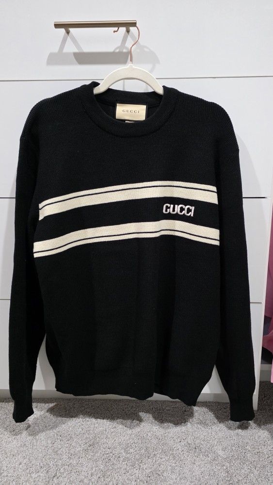 This black sweater is crafted from knit wool and features a Gucci script, crewneck, ribbed trim and drop shoulder. The regular fit sweater has a shoulder drop of 18.5", a chest of 22" and a sleeve length of 27", based on a size M. Made in Italy. Wore one just to try but it is a little big for my size.
