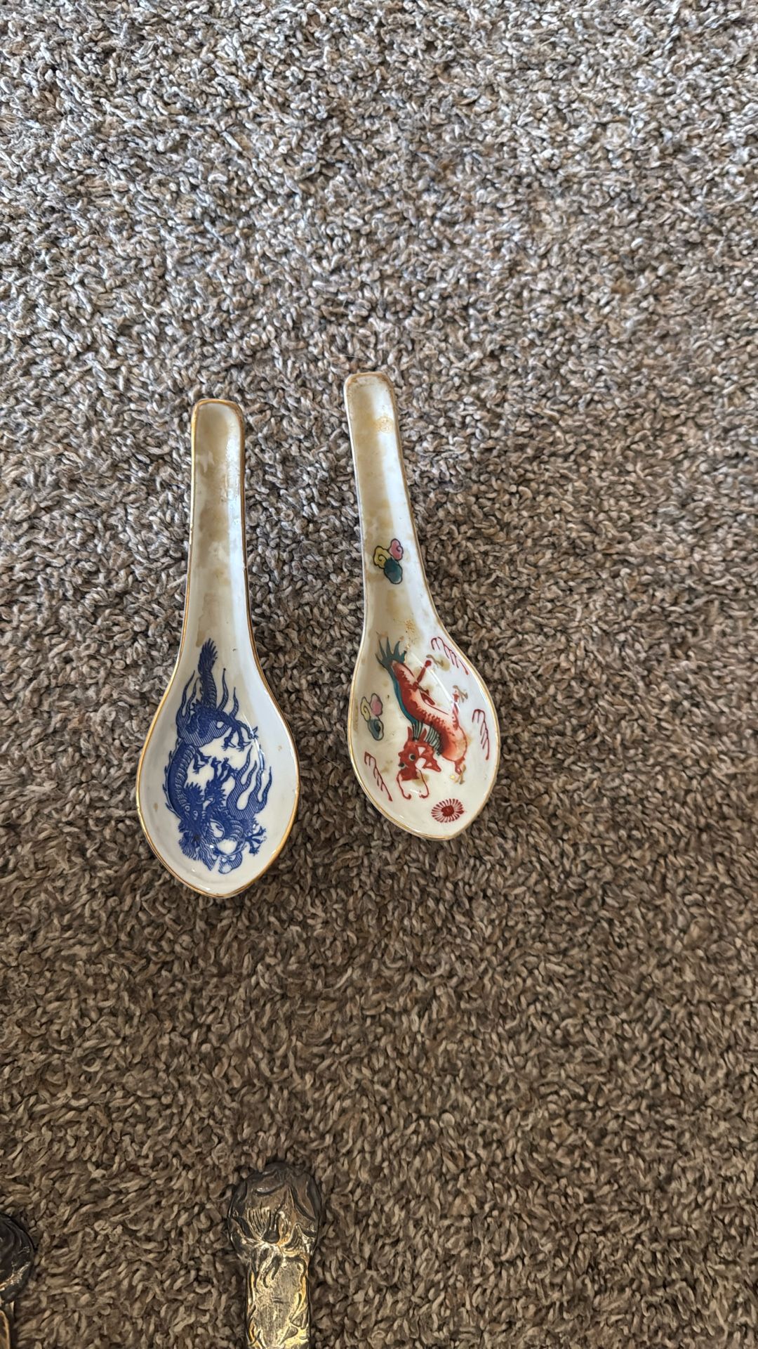 Set of 2 vintage porcelain Chinese soup spoons with hand-painted dragon designs—one in classic blue and the other in red and green. Great for collectors, display, or traditional dining. Minor wear from age, but overall in good condition.