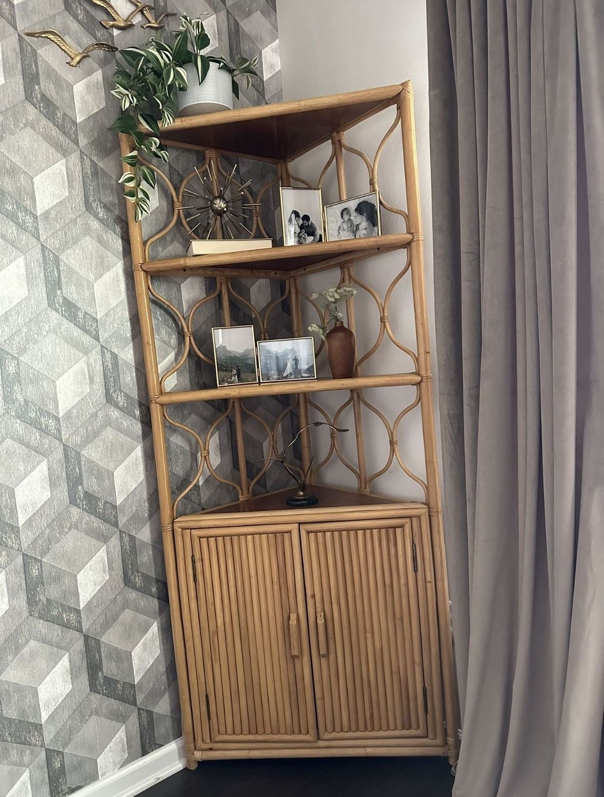 1970s Vintage Boho Chic Pencil Reed Rattan Corner Cabinet