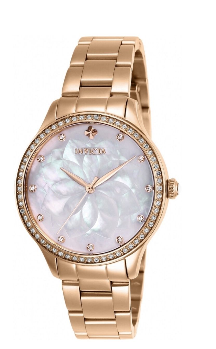 Rose gold-tone stainless steel case and bracelet. Fixed rose gold-tone bezel set with crystals. White dial with gold-tone hands and crystal hour markers. Dial Type: Analog. SII Caliber PC11 quartz movement. Scratch resistant Flame Fusion crystal. Pull / push crown. Solid case back. Round case shape. Case size: 35 mm. Case thickness: 9.5 mm. Band width: 16 mm. Band length: 6.75 inches. Fold over clasp. Water resistant at 100 meters / 330 feet. Functions: hour, minute, second. Wildflower Series. Dress watch style. Watch label: Japan Movt. Invicta Wildflower Quartz Crystal White Dial Ladies Watch Brand new with box and paperwork