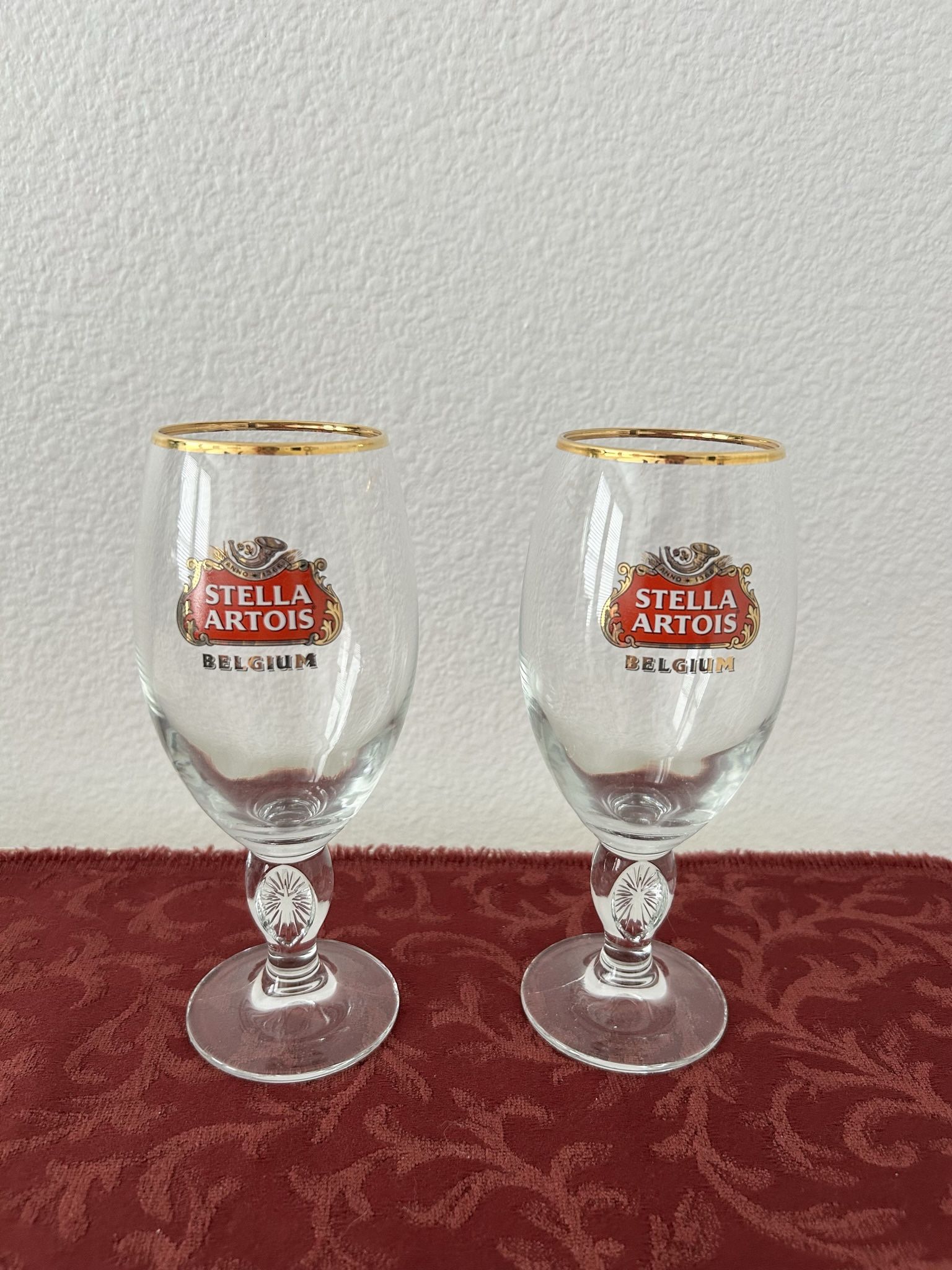Vintage Stella Artois Belgium Beer Glasses Stemmed Gold Rimmed Chalice X-Mas Gift (Set of 2)