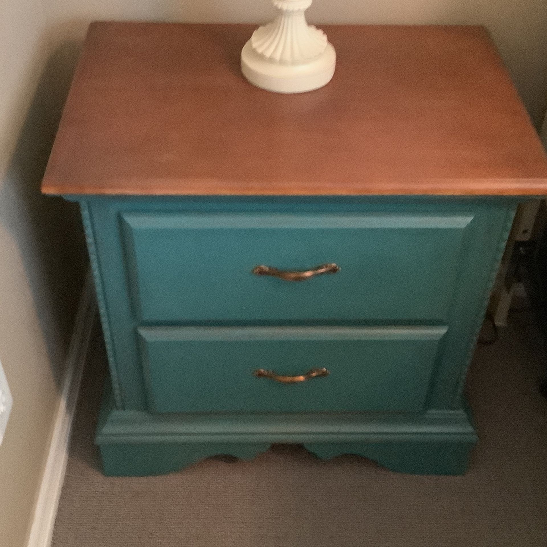 Wood stain top with teal color base, dresser 39” length and 17” width, night stand 24” length and 16” width, mirror 36” length and 16” width, good condition