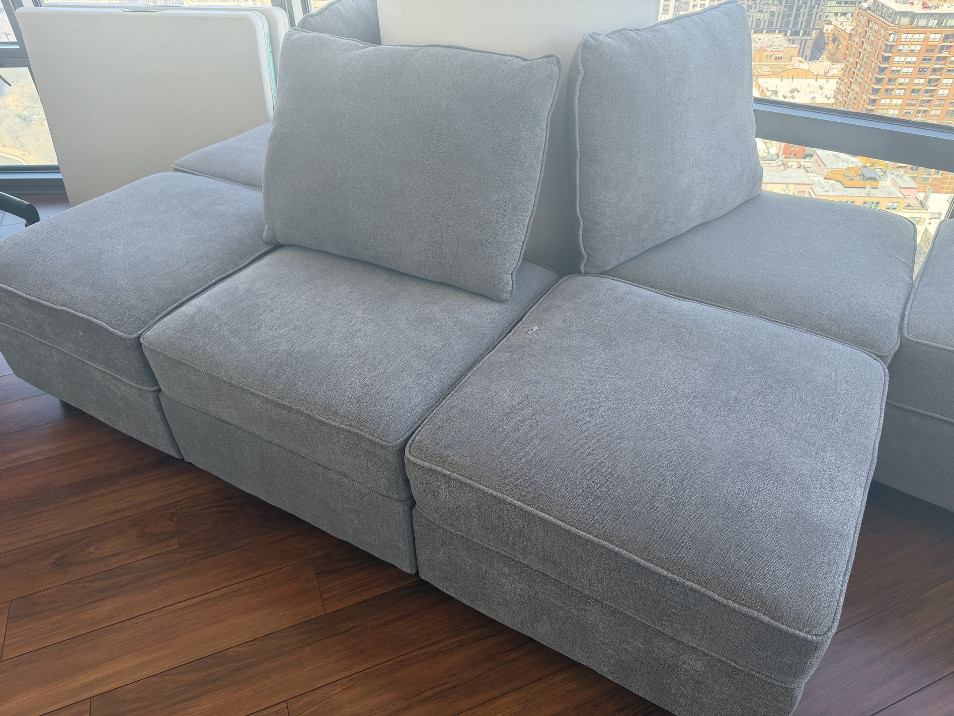 Honbay, great condition It is the middle piece, modular sofa Must pick up today between 12-2:30pm You can buy arm rest and backrest on the Honbay website or Amazon 14 of the grey sofas 10 of the grey pillows 2 of the blue sofas 2 of the blue pillows Located River North at Kingsbury Plaza (Near Grand and Kingsbury). Ottoman size: 25.6 W × 25.6 D × 17.72 H (inches), solid wood frame HONBAY modular sectional sofa is crafted with a solid wood frame, foam fill, and sinuous spring supports for a modern elegant look. With the advantages of modular sofa sectional couch, any module can be moved to combine to the look you need. • [Modular Sectional Sofa Sturdy solid wood frame, 100% polyester fabric, filled with high-quality sponge, making this modular sofa beautiful and comfortable, it can be perfectly matched with your living room, house or conference • [Flexible Combination]. For convenience and need you can move and reassemble the modular couch, this is the charm of the modular sectional sofa • (Storage Seat) under each seat of the Sofa, it is not only a holy place for children's toys, but also can store blankets and remote control to make the room look neat and clean