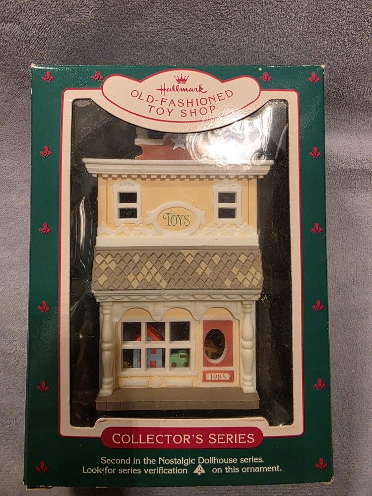 Hallmark Keepsake Ornament: 1985 Old-Fashioned Toy Shop from the Nostalgic Dollhouse Series. It is the second item in the series. The item number is QX4975. It was originally released in 1985. The ornament is approximately 4 inches tall. Great Condition