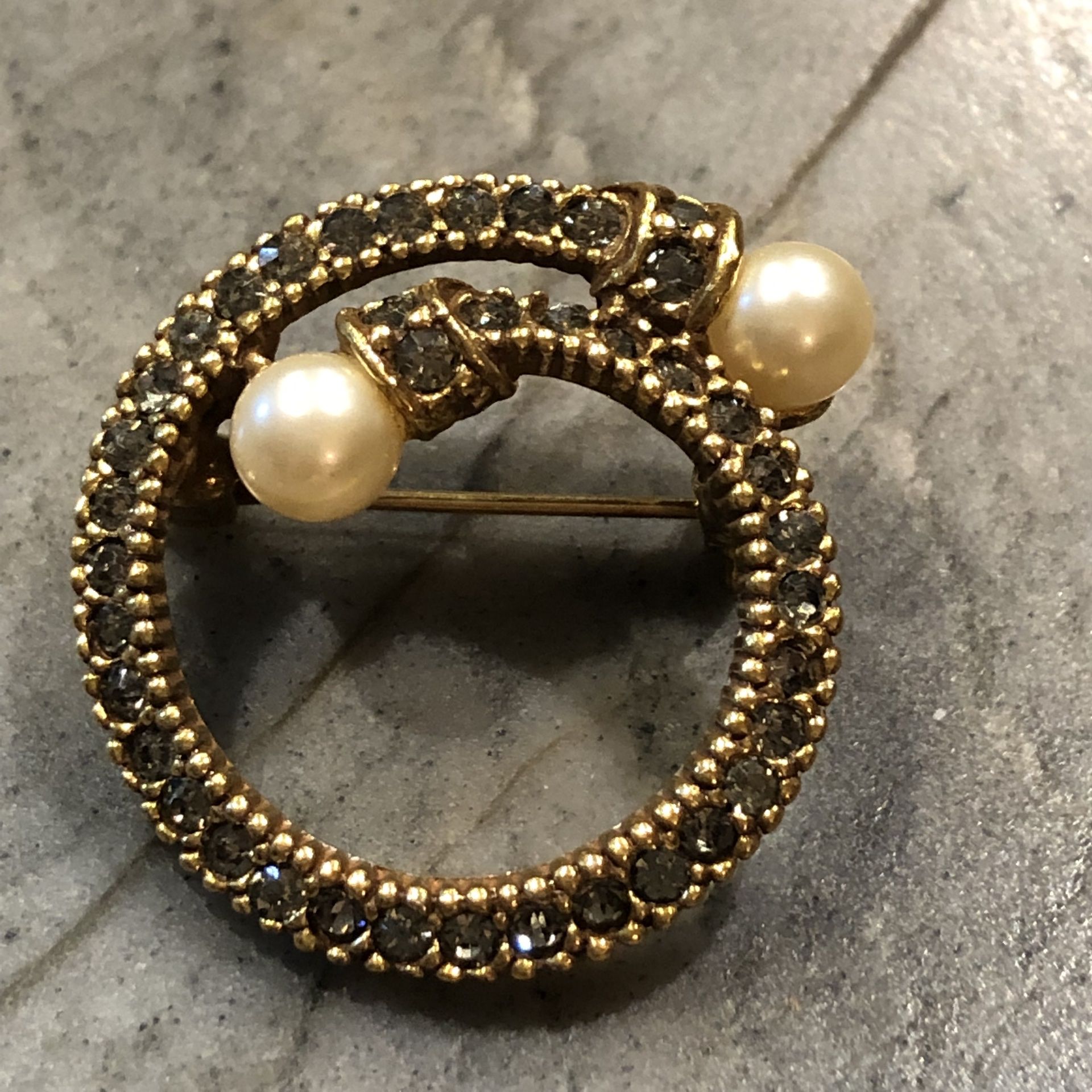 This sweet vintage pin has smoky silver/clear rhinestones with faux pearls on the ends set in a complimentary gold tone circular mounting. Condition is very good, clasp works well, stone are bright and cheery. Measures approx 1.25” dia