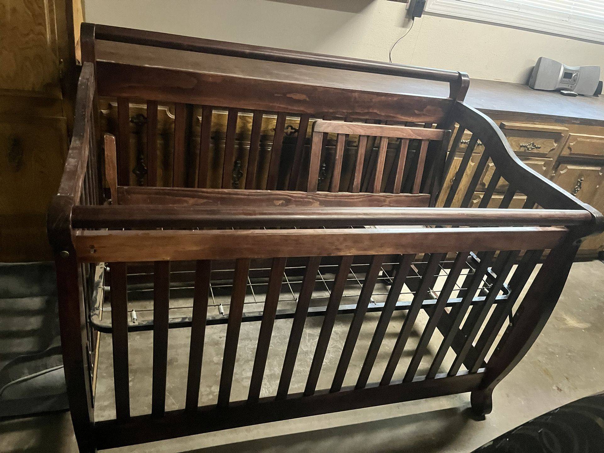 This is an all wood cherry stained crib. Can be a crib, toddler bed, or full bed frame. Easy assembly. Great condition. No low offers and no returns. Thank you