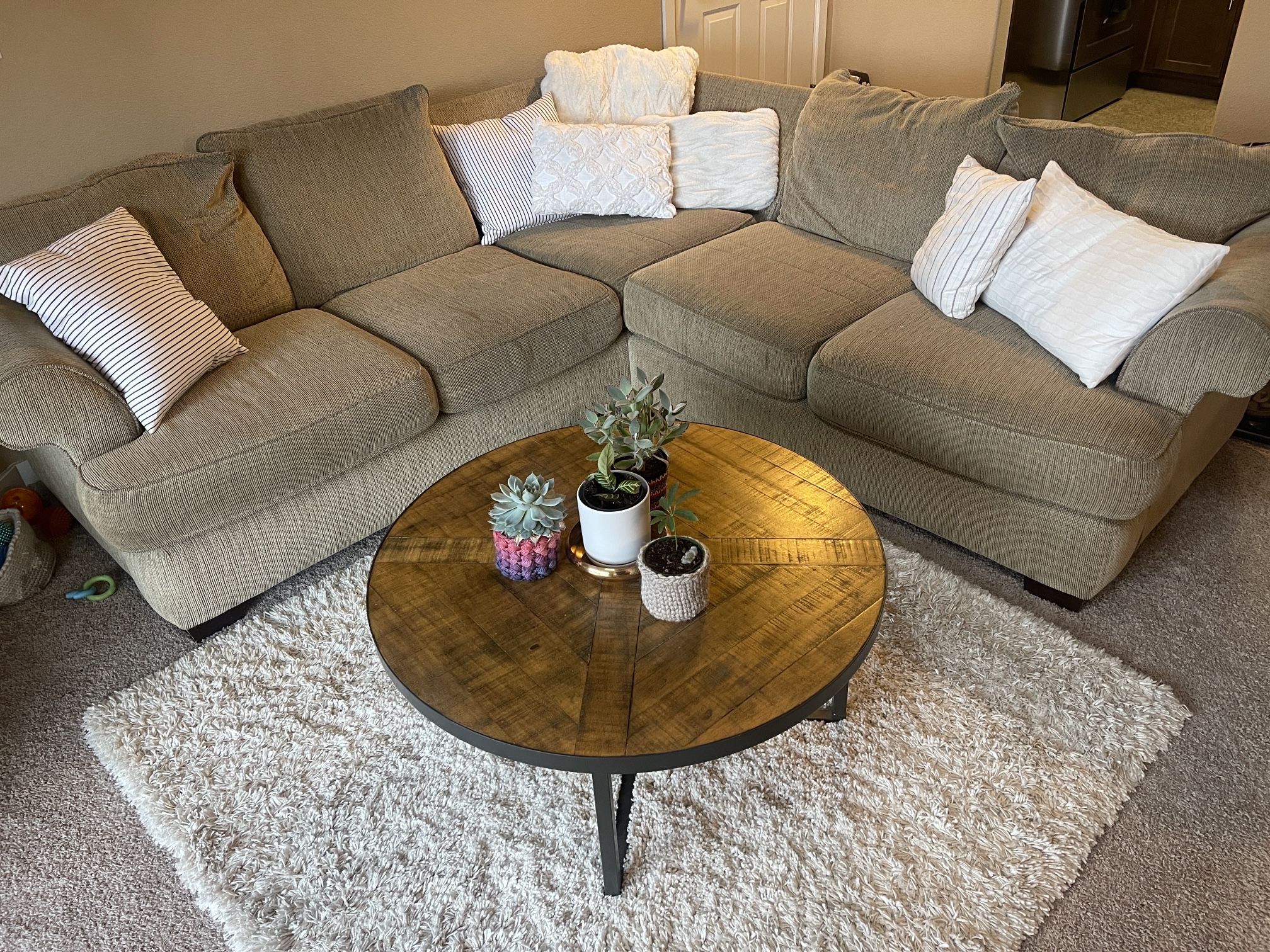 Looking to find someone who would like our old couch. We are buying two new Love seats to fit into our living room area. The couch is very comfortable, but is missing two corner cushions. We put white pillows up there and you’re also welcome to take the white pillows with you if you would like. The couch is 97 inches long on each side and 39 inches wide. It does come apart into two pieces, one with two sections and the other with three sections. Well, taken care of, but not perfect. Giving it away free, but you must come and haul it away