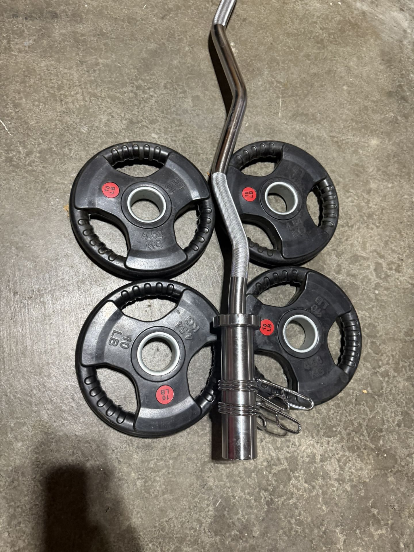 Top quality very heavy bar in perfect condition. Amazing weights more available. Weight dumbbells