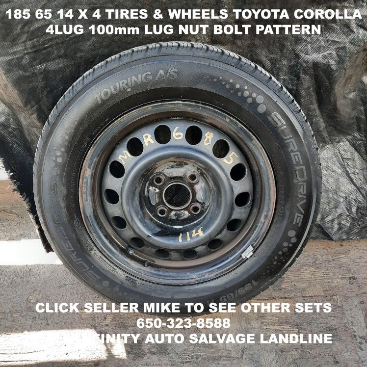 These wheels are stock for 1993 to 2002 Toyota Corolla & will fit many others with the same lug nut bolt pattern. Tires are 2023 Suredrive with about 90% tread left. You can put these tires on your wheels and return these wheels if they are alloy for a discount. Call Infinity Auto Salvage at six five zero, three two three, eight five eight eight. Check out the many other sets of wheels and tires we have for sale by clicking seller Mike.