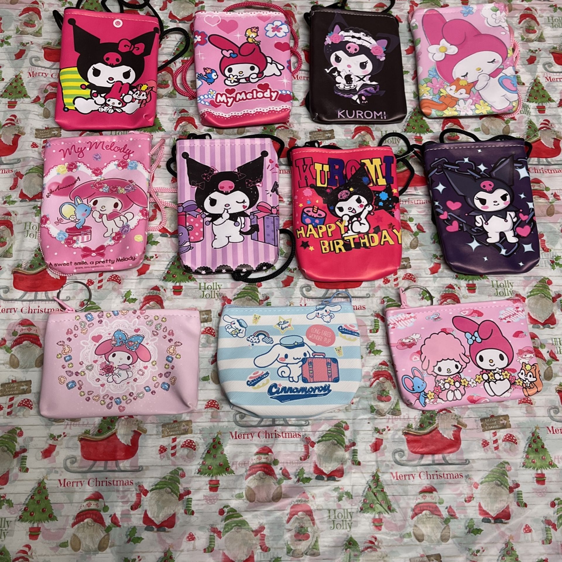 New (6) assorted Kuromi and Melody small 5 x3 1/2 inch bags. Each has zipper and strap is 21 inches long. Very cute for valentines . (3) coin bags 2 Melody with key ring. And 1 cinamoroll. Each $2.00 The (2) black bags are gone but rest are there